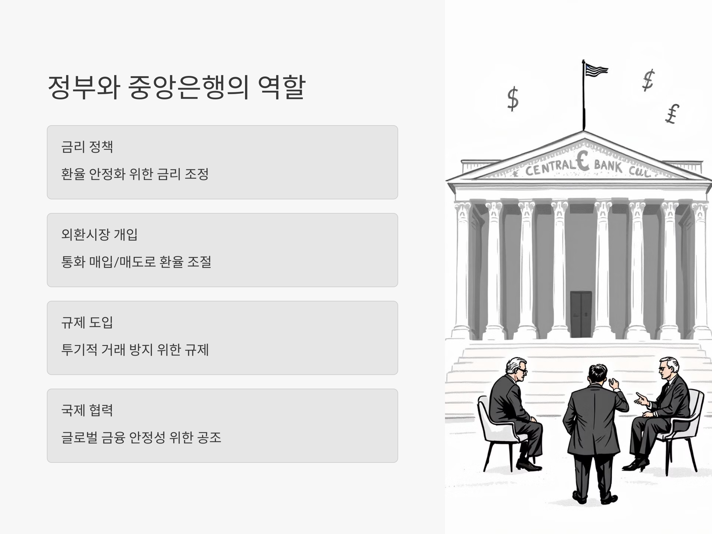 정부와 중앙은행은 환율과 금융시장의 변동성을 관리하는 데 중요한 역할을 합니다. 중앙은행은 금리 정책을 통해 환율 변동성에 대응할 수 있으며, 필요시 외환 시장에 개입하기도 합니다. 예를 들어, 중앙은행은 자국 통화의 급격한 하락을 방지하기 위해 외환 보유고를 사용하여 통화를 매입하거나 매도할 수 있습니다. 이러한 정부의 개입은 금융시장의 안정을 돕고, 환율 변동성을 일정 수준으로 유지할 수 있도록 합니다.