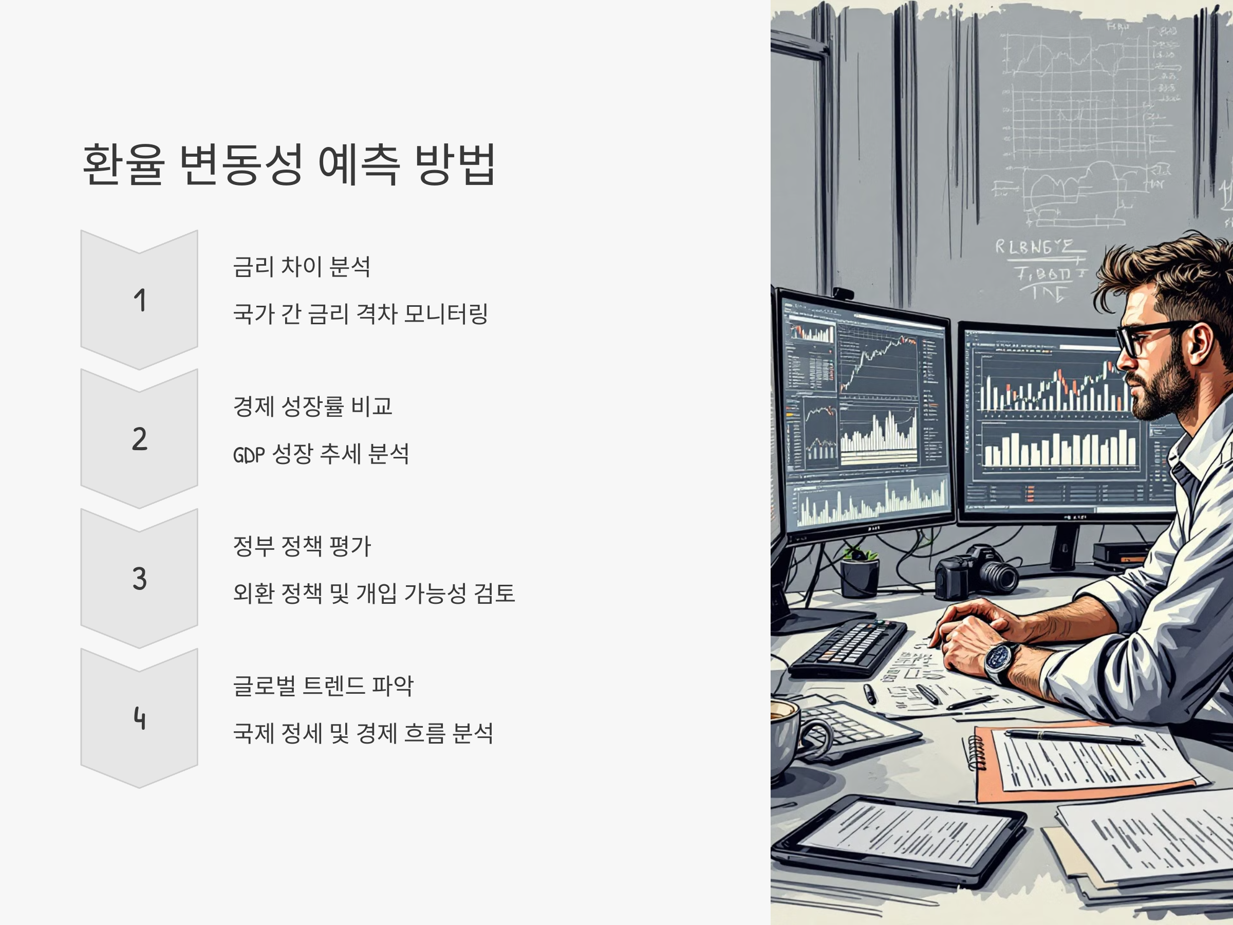 환율 변동성은 예측하기 매우 어렵습니다. 다양한 외부 요인들이 복합적으로 작용하기 때문입니다. 그럼에도 불구하고 경제 전문가들은 환율을 예측하기 위해 몇 가지 주요 지표를 참고합니다. 예를 들어, 금리 차이, 경제 성장률, 정부의 외환 정책 등이 주요 지표로 사용됩니다. 또한, 글로벌 경제의 주요 트렌드와 정치적 안정성도 중요한 예측 요소가 됩니다.