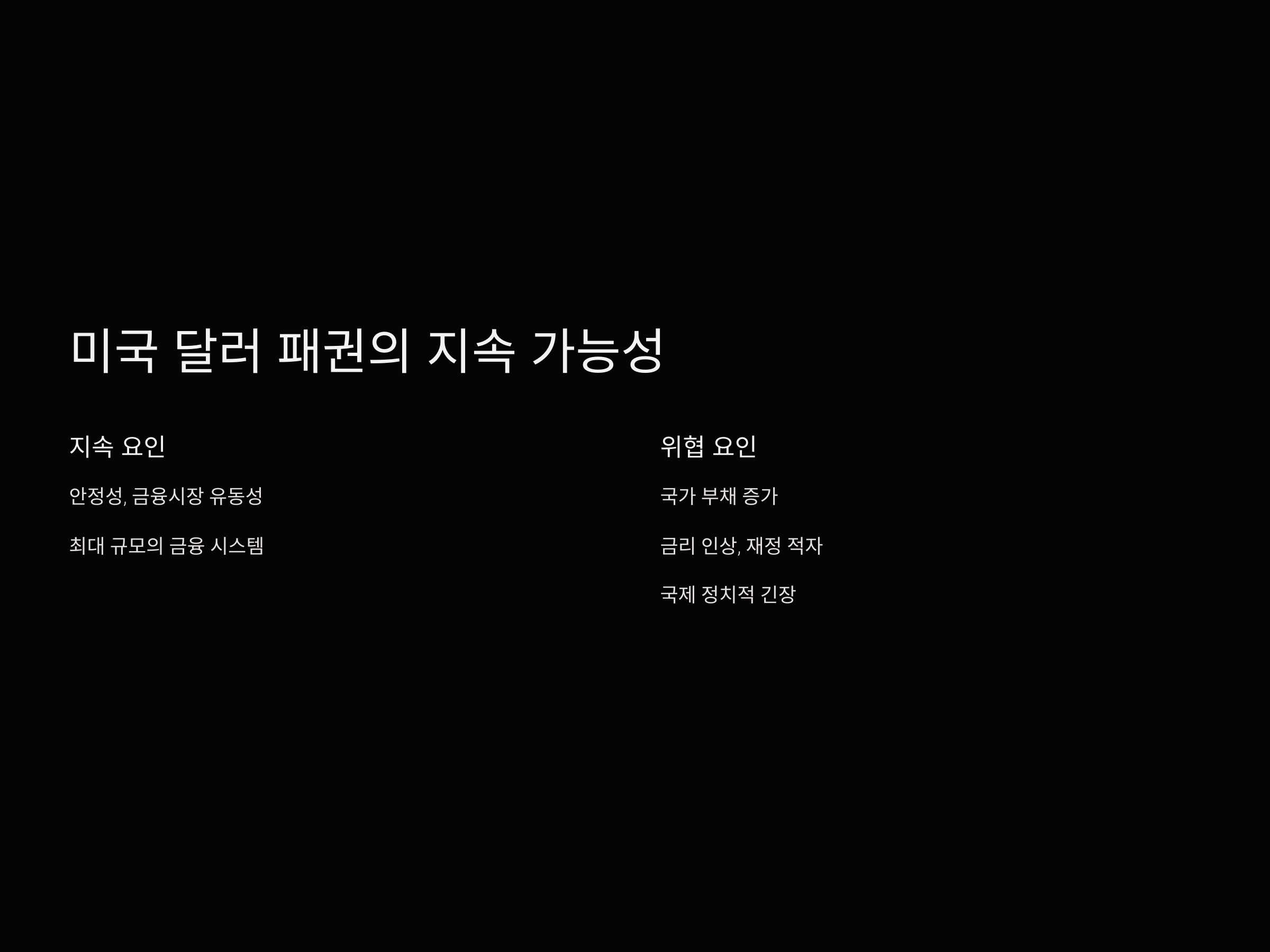 최근 몇 년간의 상황을 보면, 미국의 금리 인상, 재정 적자, 그리고 국제적인 정치적 긴장들이 달러의 안정성을 위협할 수 있습니다. 특히, 미국이 경제 제재를 강화하면서 일부 국가들은 달러 의존도를 낮추려는 노력을 기울이고 있습니다. 하지만 달러는 여전히 많은 국가들이 외환 보유고로 사용하며, 미국의 금융 시스템은 여전히 가장 큰 규모를 자랑하고 있기 때문에 단기간에 달러 패권이 흔들릴 가능성은 낮다는 견해도 있습니다.