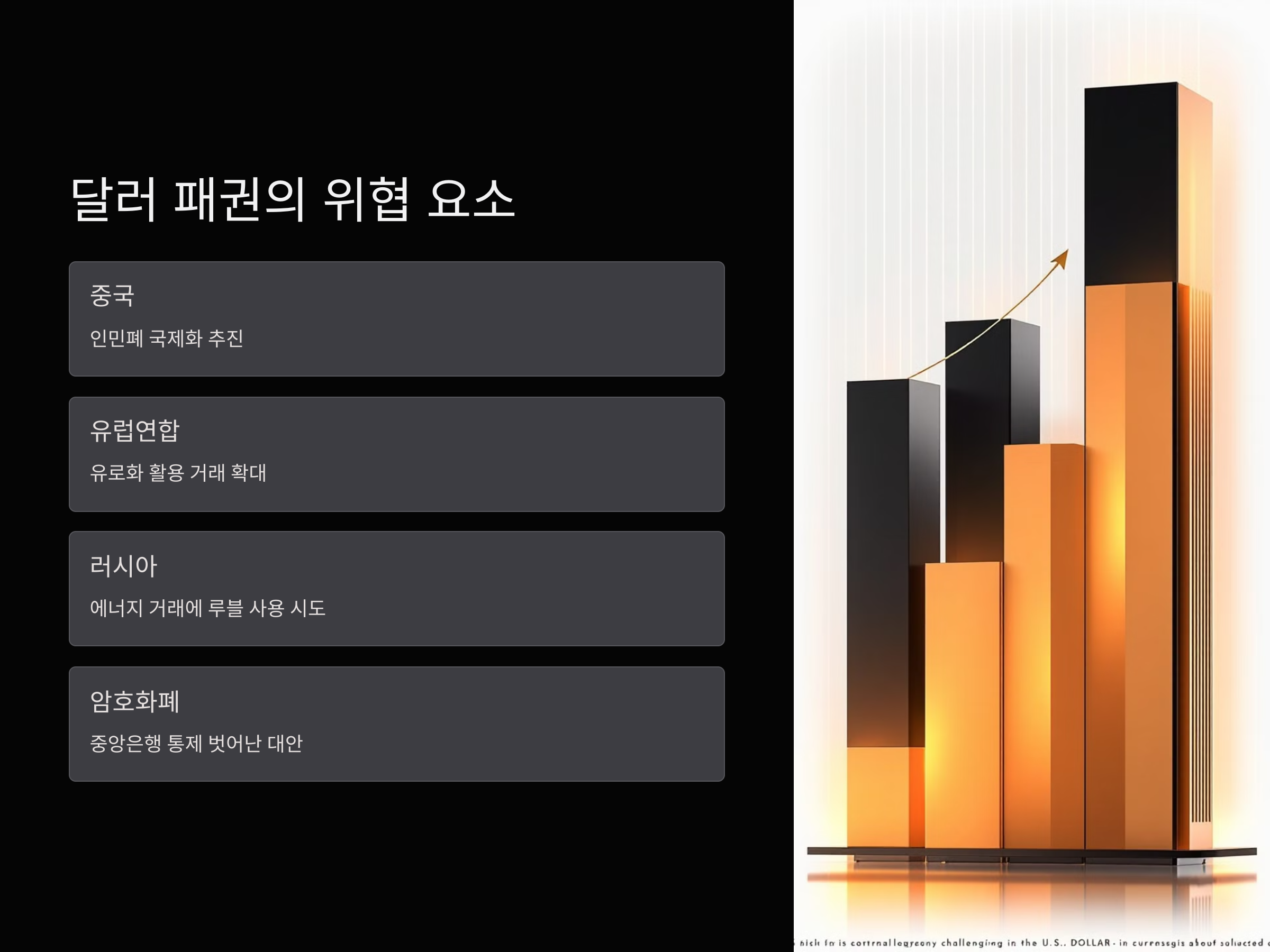 최근 몇 년간 미국 달러 패권에 대한 위협이 커지고 있습니다. 특히 중국, 유럽연합, 러시아 등의 국가들이 자국 통화를 국제 거래에 사용하려는 움직임을 보이기 시작했습니다. 중국은 인민폐의 국제화를 목표로 하고 있으며, 유럽연합은 유로화를 활용한 거래를 늘려가고 있습니다. 러시아는 석유나 천연가스를 판매할 때, 달러 대신 자국의 루블이나 다른 통화를 사용하려는 시도를 하고 있습니다.
