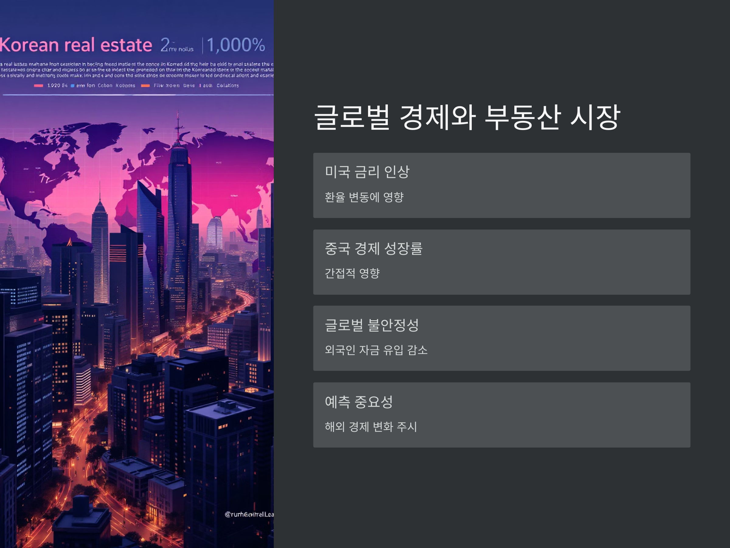 글로벌 경제가 불안정할 경우, 외국인들이 자금을 국내로 유입하기보다는 다른 안전한 자산을 선호할 수 있습니다. 따라서 해외 경제의 불확실성이 클 경우, 환율 변동을 예의주시하면서 부동산 시장의 변화를 예측할 필요가 있습니다.
