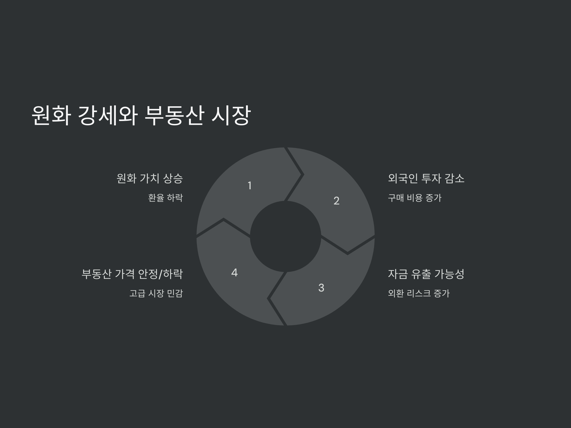 환율 하락, 즉 원화 강세는 외국인 투자자들에게 불리하게 작용합니다. 이는 외국인 투자자들이 자산을 구매할 때 더 많은 비용을 지불해야 하므로, 투자 의향이 줄어들 수 있습니다. 이 경우 부동산 가격이 안정되거나 하락할 가능성이 큽니다.