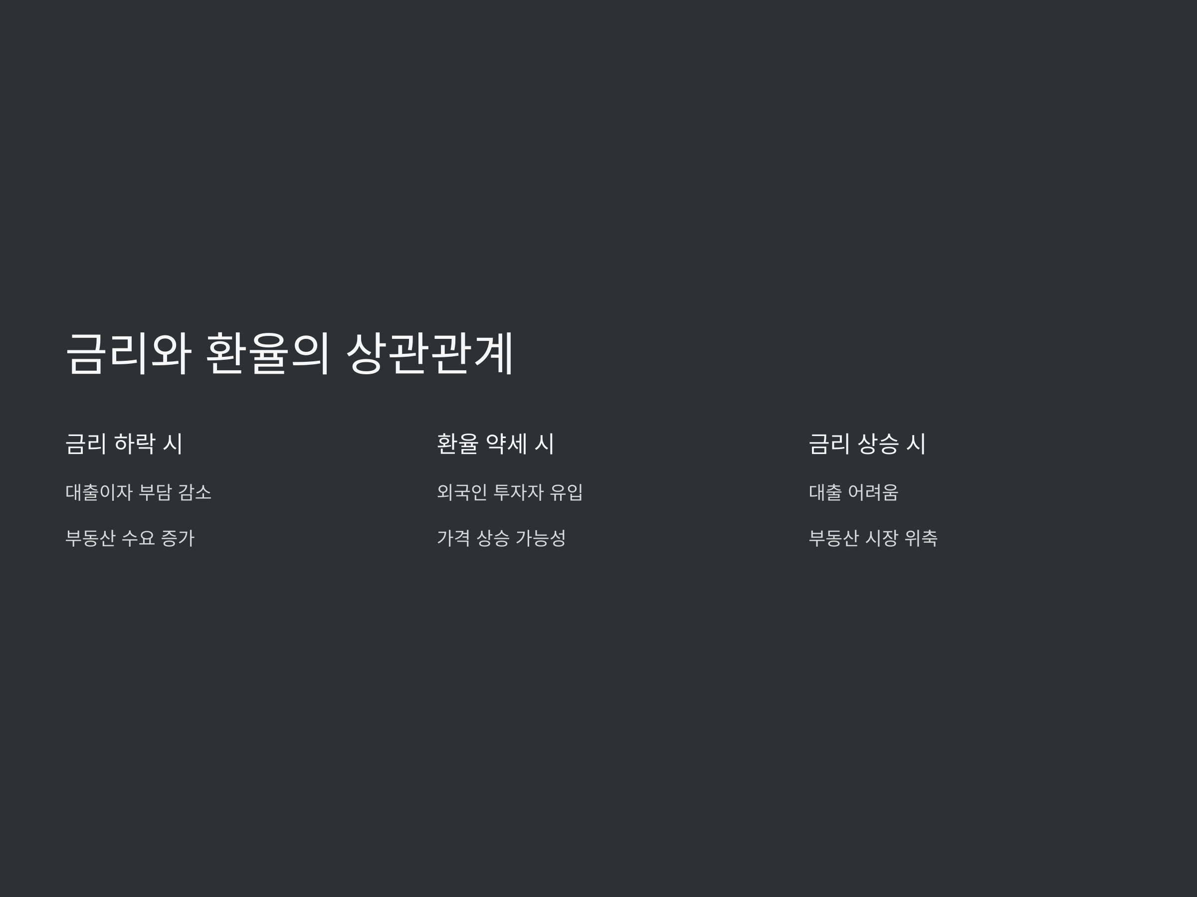 반대로 금리가 오르면 대출이 어렵고, 국내 수요가 감소하는 동시에 환율 변동까지 겹쳐 부동산 시장이 위축될 수 있습니다. 이와 같은 금리와 환율의 상호작용을 통해 부동산 시장을 예측하는 것이 중요합니다.