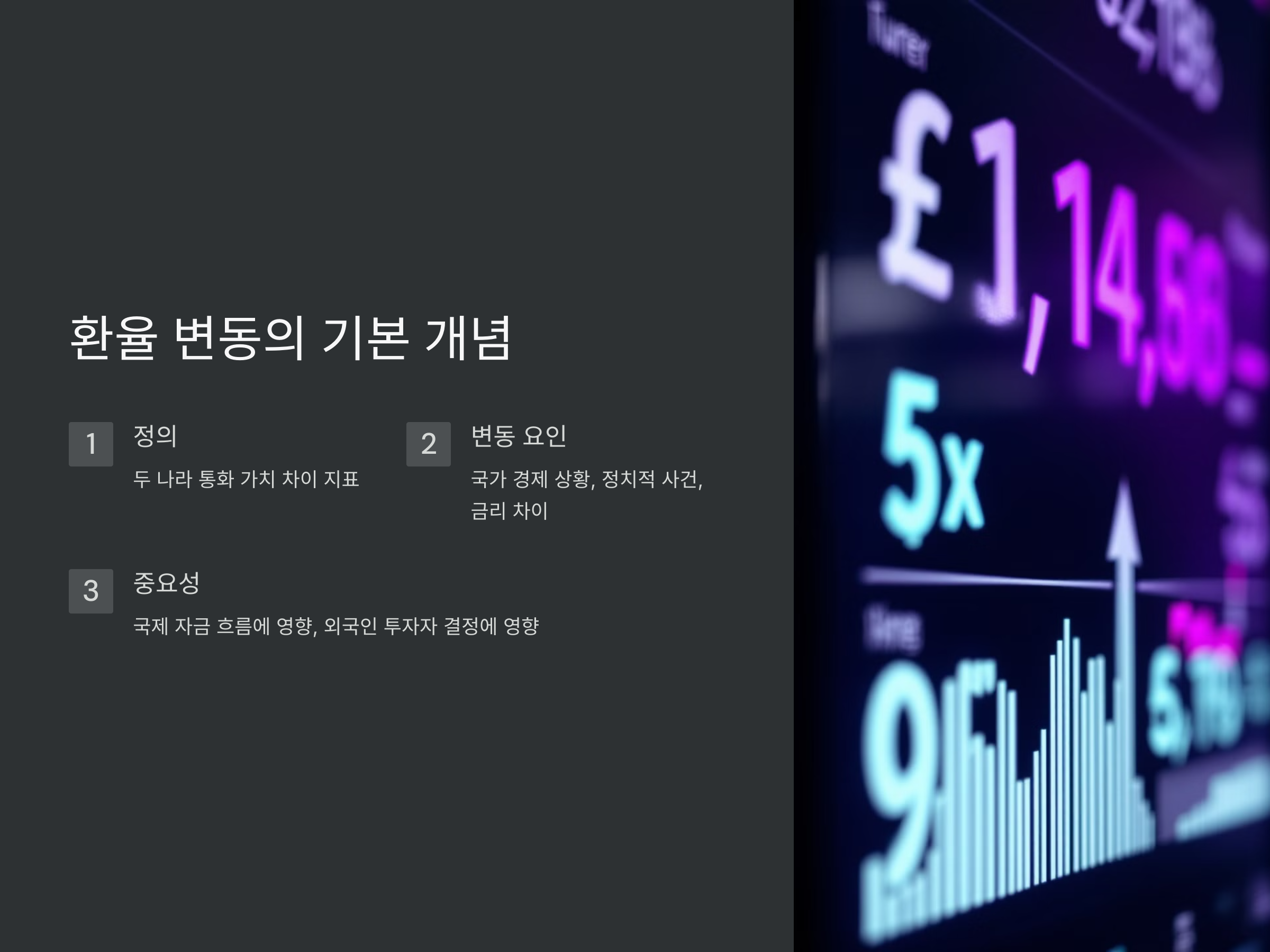 환율은 두 나라의 통화 가치가 얼마나 차이가 나는지를 나타내는 지표입니다. 환율이 변동하는 이유는 국가 경제 상황, 정치적 사건, 금리 차이 등 여러 요인들이 복합적으로 작용하기 때문입니다. 특히, 환율이 급격히 변동하면 수출입 가격에 영향을 주고, 그 결과 국내 경제에 영향을 미치게 됩니다.