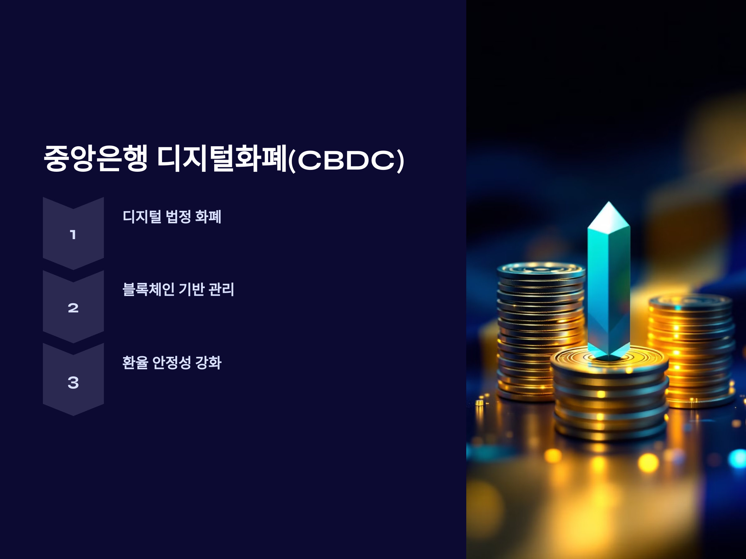 중앙은행 디지털화폐(CBDC)는 중앙은행이 발행하는 디지털 형태의 법정 화폐입니다. 기존의 종이 화폐를 대체할 수 있는 디지털 자산으로, 블록체인 기술을 기반으로 발행되고 관리됩니다. CBDC의 도입은 여러 나라에서 활발히 논의되고 있으며, 환율 안정성에 큰 영향을 미칠 것으로 예상됩니다.
