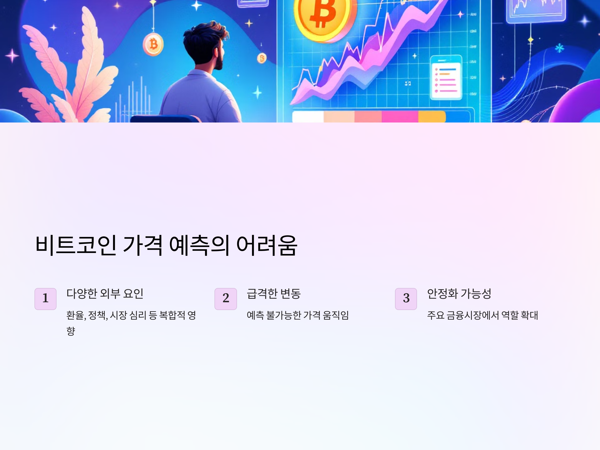 비트코인 가격은 다양한 외부 요인에 영향을 받기 때문에 예측이 매우 어렵습니다. 특히 환율 변동은 비트코인 가격에 간접적으로 영향을 미칠 수 있으며, 이는 예측을 더욱 어렵게 만듭니다. 환율 변동이 큰 폭으로 일어날 때, 비트코인 가격도 그만큼 급격하게 변동할 수 있기 때문에, 투자자들은 항상 시장을 주의 깊게 살펴봐야 합니다.