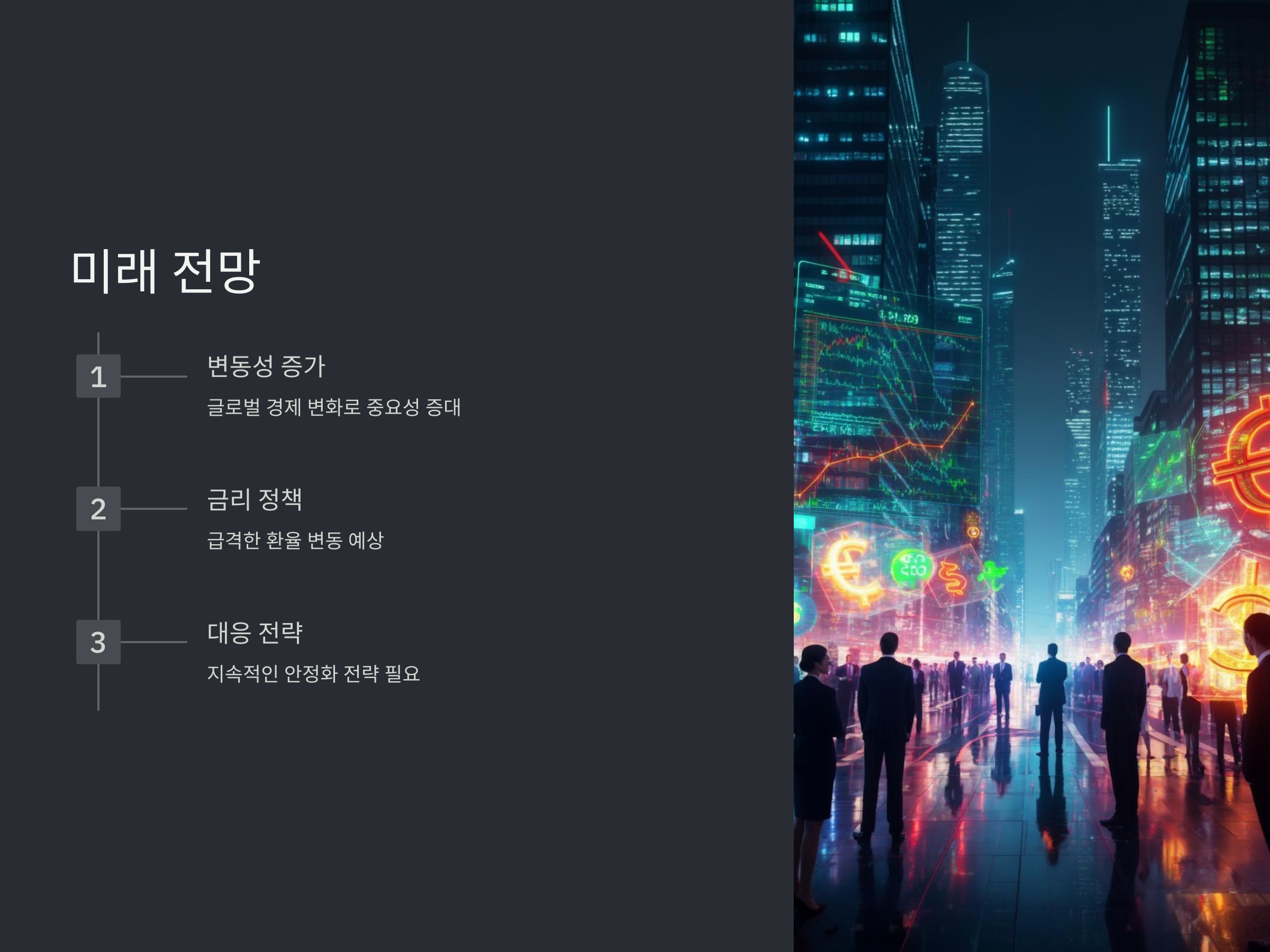 향후 환율 변동성은 글로벌 경제의 변화와 함께 더욱 중요해질 것입니다. 특히 금리 정책과 국제 정치 상황에 따라 환율의 급격한 변동이 예상되므로, 선진국들은 경제 안정성을 유지하기 위해 적절한 대응 전략을 지속적으로 마련해야 할 것입니다.
