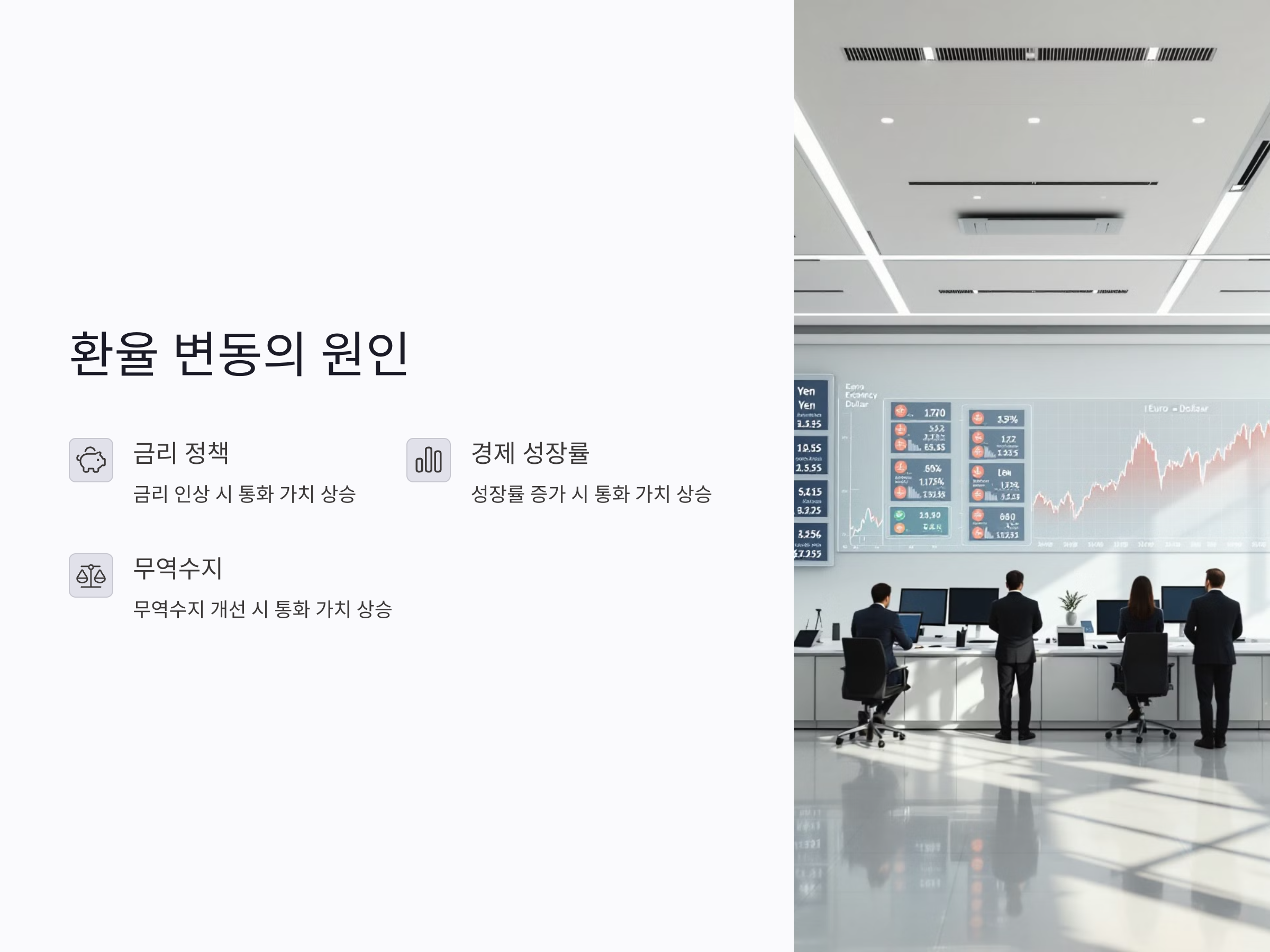 환율 변동의 원인은 다양한 경제적 요인들에 의해 결정됩니다. 첫째, 국가의 금리 정책이 환율에 큰 영향을 미칩니다. 중앙은행이 금리를 인상하면 해당 국가의 통화 가치는 상승하고, 반대로 금리를 내리면 통화 가치는 하락합니다. 둘째, 경제 성장률과 무역수지의 변화도 중요한 변수입니다. 무역수지가 개선되면 통화 가치는 상승하고, 반대로 무역수지가 악화되면 통화 가치는 하락합니다.