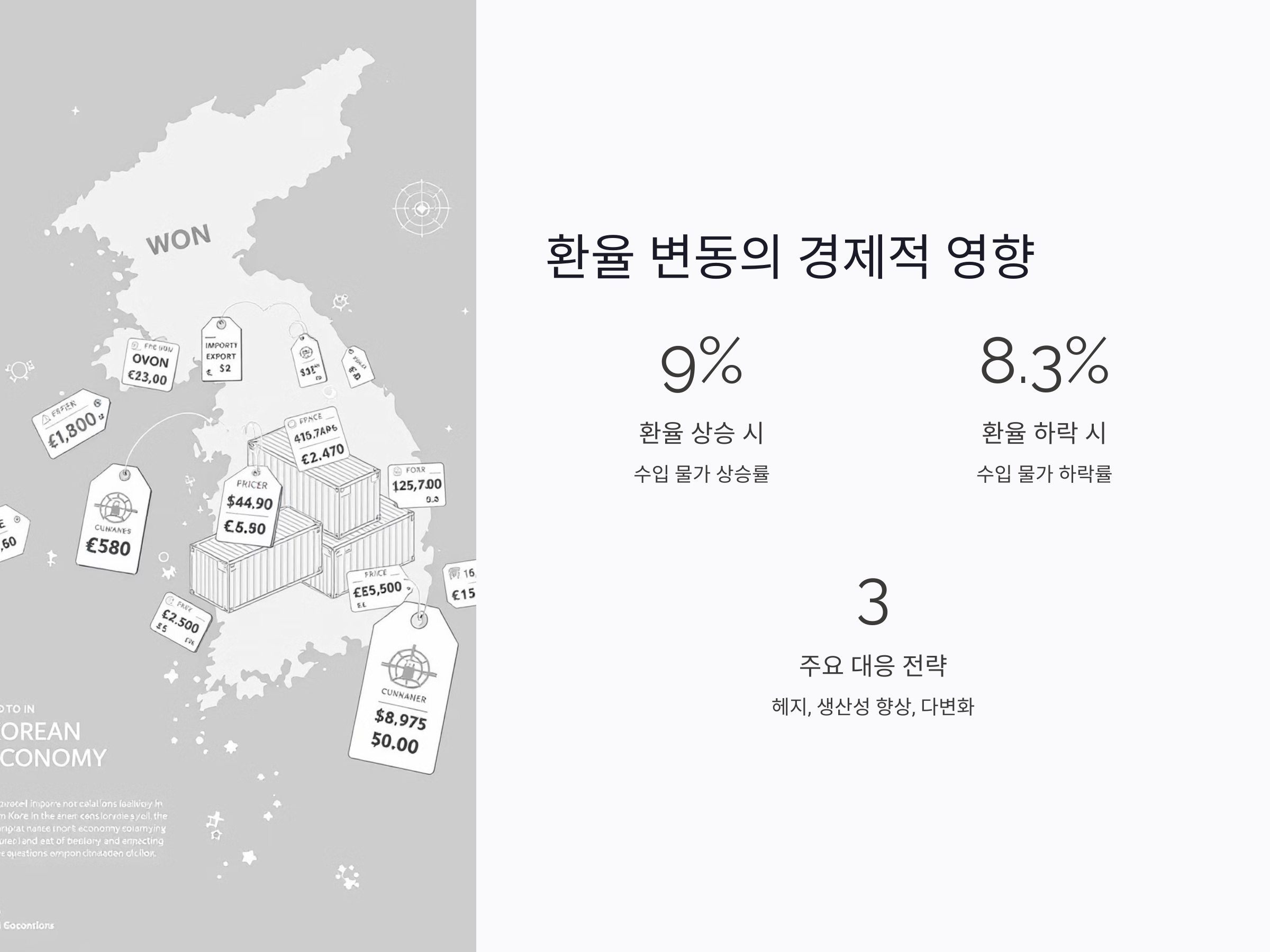 환율 변동은 경제에 큰 영향을 미치며, 특히 수입 물가에 직접적인 영향을 미칩니다. 환율이 상승하면 수입 물가가 오르고, 환율이 하락하면 수입 물가는 낮아집니다. 이러한 변화는 소비자 물가에 영향을 미쳐 경제 전반에 영향을 줄 수 있습니다. 기업들은 환율 변동에 대비하기 위해 다양한 전략을 세워야 하며, 정부는 환율 안정화와 물가 정책을 통해 경제 안정을 유지해야 합니다.