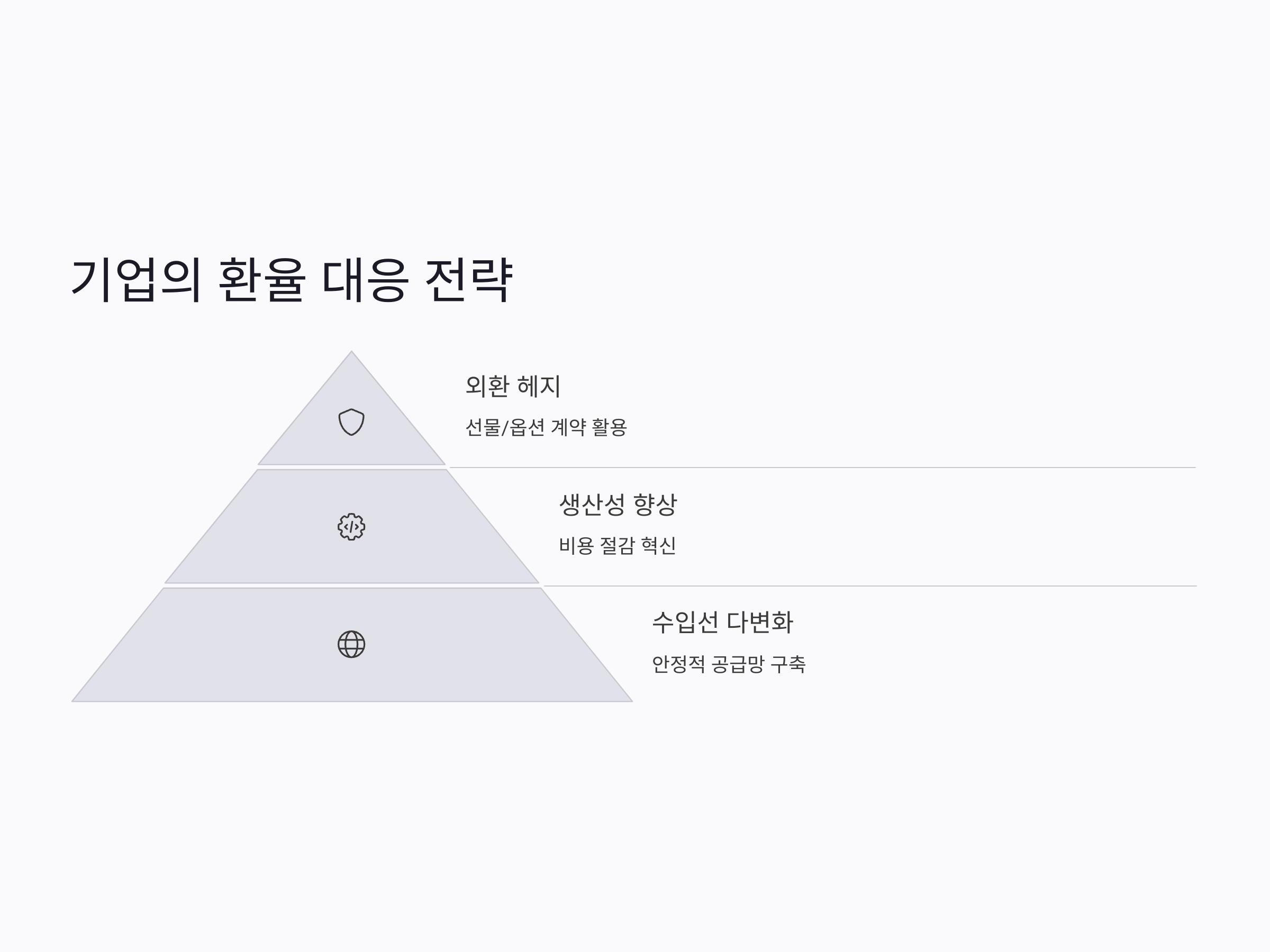 환율 변동에 대응하기 위해서는 기업과 정부 차원에서 다양한 전략을 마련해야 합니다. 기업들은 환율 변동 리스크를 최소화하기 위해 외환 헤지 전략을 활용할 수 있습니다. 외환 선물 계약이나 옵션 계약 등을 통해 환율 변동에 따른 위험을 관리할 수 있습니다. 또한, 수입 물가 상승을 대비하기 위해 생산성을 높이거나, 원가 절감을 위한 혁신적인 방법을 모색해야 합니다.