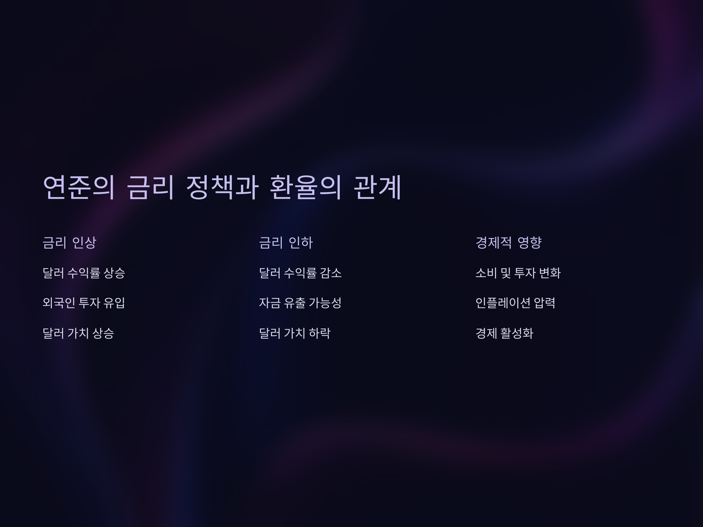 미국 연방준비제도의 금리 정책은 글로벌 경제와 환율에 매우 중요한 영향을 미칩니다. 연준은 금리를 통해 미국 경제를 조절하며, 이 금리는 전 세계적으로 영향을 미칩니다. 연준이 금리를 인상하면, 미국 달러의 수익률이 상승하게 되어 외국인 투자자들이 미국으로 자금을 끌어들이게 됩니다. 이로 인해 달러 가치가 상승하게 됩니다.