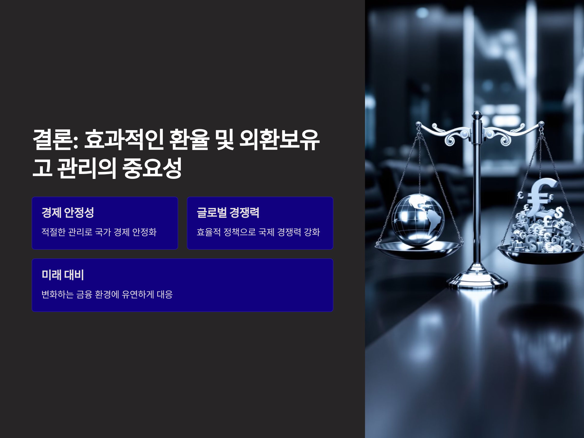 - 금융 위기 대비: 글로벌 금융 위기나 외환 위기 발생 시 경제적 충격을 완화할 수 있습니다.