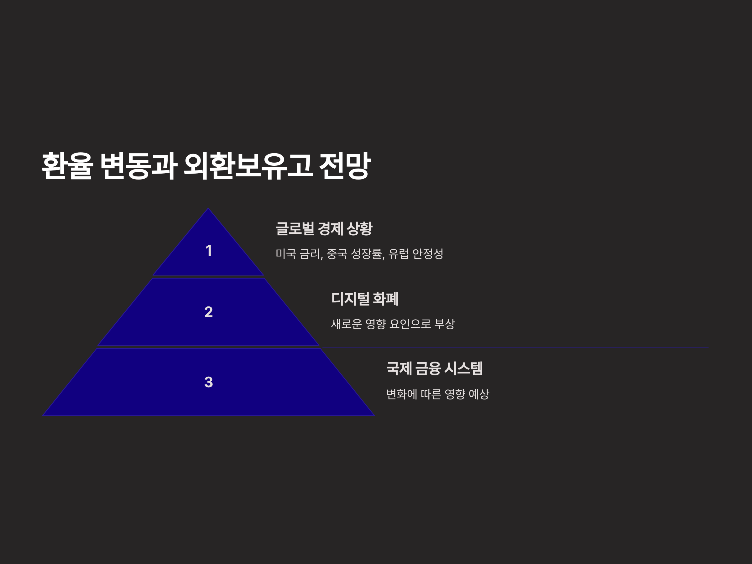 향후 환율 변동성과 외환보유고 관리는 글로벌 경제 상황과 긴밀하게 연관될 것으로 보입니다. 특히, 미국의 금리 정책, 중국 경제 성장률, 유럽의 경제 안정성 등이 중요한 변수로 작용할 것입니다. 또한, 디지털 화폐의 도입과 국제 금융 시스템의 변화가 환율과 외환보유고에 새로운 영향을 미칠 것으로 예상됩니다.