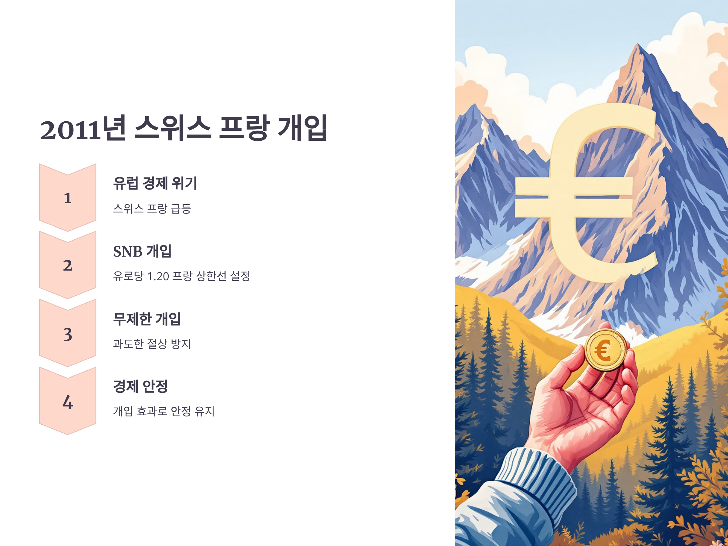 2011년 유럽 경제 위기 속에서 스위스 프랑의 급등을 막기 위해 스위스 중앙은행(SNB)은 유로당 1.20 프랑의 상한선을 설정하고 무제한적인 외환시장 개입을 단행했습니다. 이를 통해 스위스 프랑의 과도한 절상을 방지하고 경제 안정을 유지할 수 있었습니다.