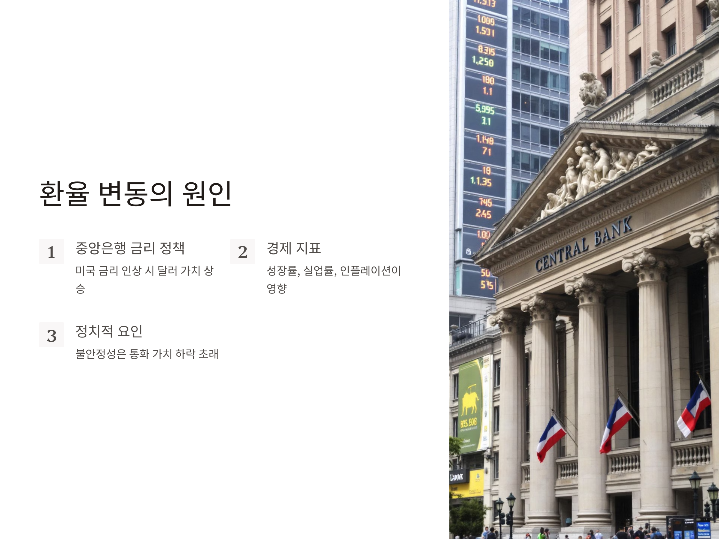 환율은 여러 경제적, 정치적 요소에 의해 결정되며, 이 요소들이 트레이딩 전략에 큰 영향을 미칩니다. 환율 변동의 주요 원인으로는 중앙은행의 금리 정책, 경제 성장률, 실업률, 인플레이션, 그리고 국제적인 정치 사건 등이 있습니다. 예를 들어, 미국의 금리가 인상되면 미국 달러의 가치가 상승하는 경향이 있습니다. 반면, 정치적 불안정성이나 경제 위기가 발생하면 해당 국가의 통화 가치가 하락할 수 있습니다.