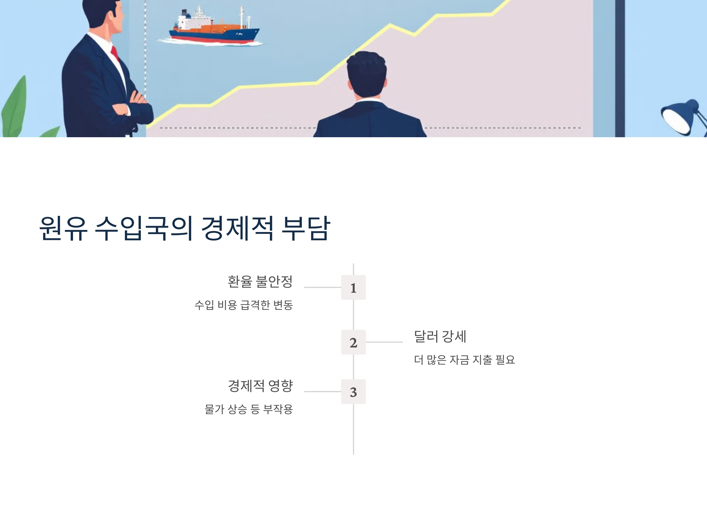 환율 변동은 원유 수입국들에게 경제적 부담을 가중시킬 수 있습니다. 특히, 환율이 불안정할 경우 원유 수입 비용이 급격히 변동하여 수입국들의 경제에 부담을 줄 수 있습니다. 예를 들어, 달러가 강세를 보일 때 원유 수입국들은 더 많은 자금을 지출해야 하며, 이는 물가 상승과 같은 부작용을 초래할 수 있습니다.