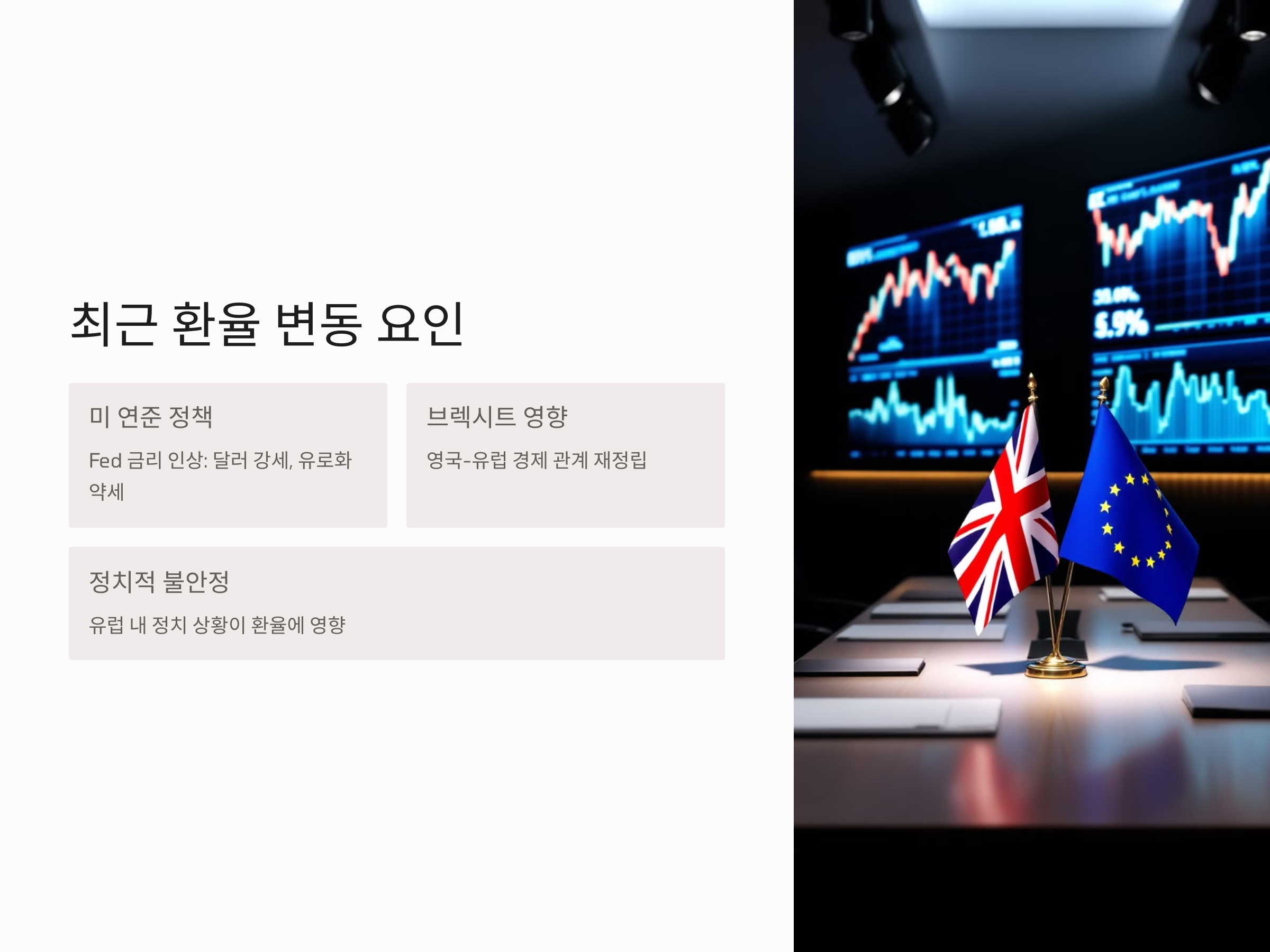 또한, 유럽 내 정치적 불안정성과 함께 영국 브렉시트의 여파도 환율에 영향을 주었습니다. 브렉시트가 본격적으로 시행되면서 영국과 유럽 간의 경제적 관계가 재정립되었고, 이는 유로화와 영국 파운드 간의 환율 변동에 큰 영향을 미쳤습니다. 이러한 변화는 유럽 경제 전반에 불확실성을 야기하며, 기업들의 해외 투자나 교역에 영향을 미쳤습니다.