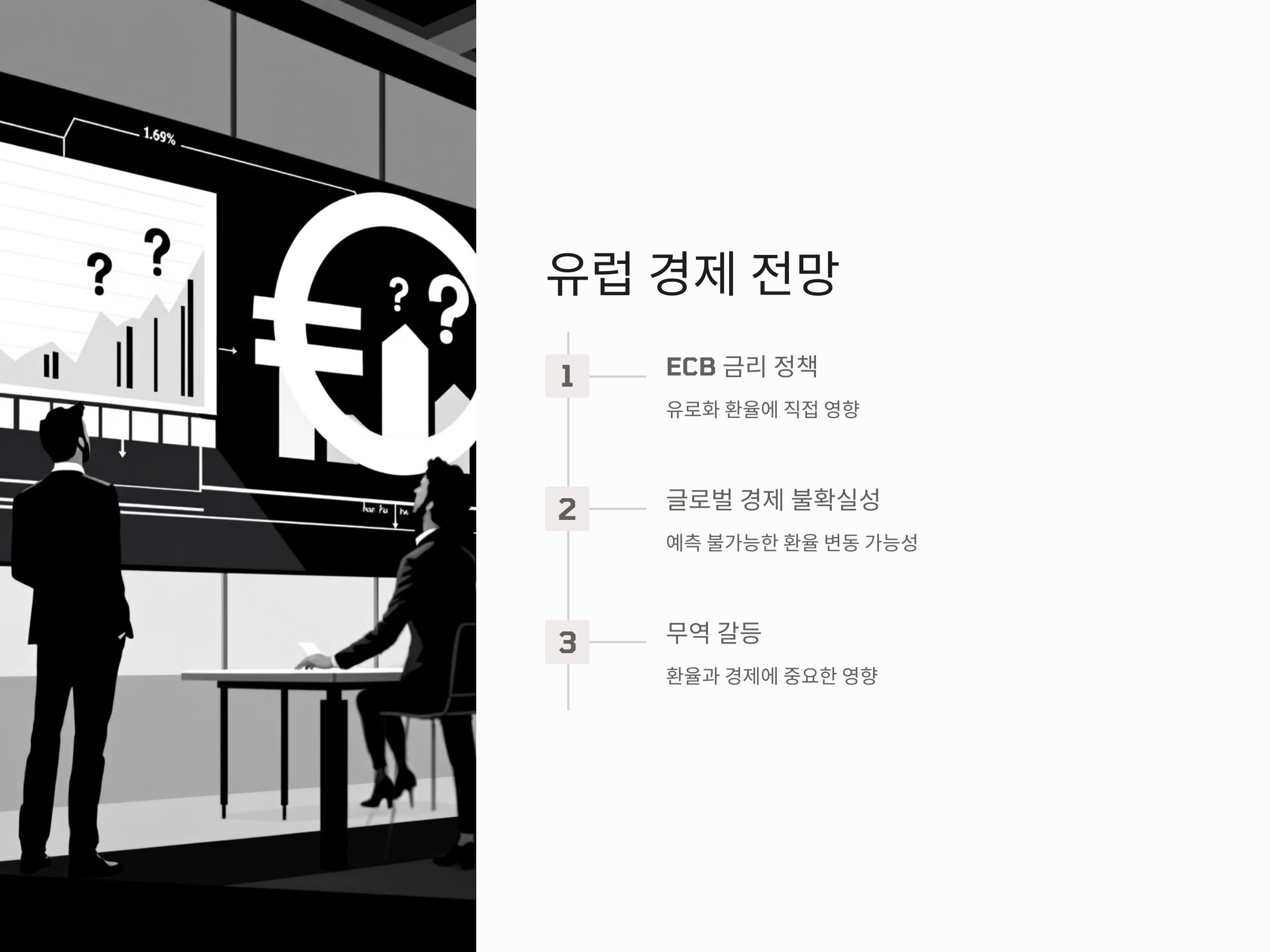 하지만 환율 변동은 항상 예측 가능한 방향으로 흘러가지는 않습니다. 세계 경제의 불확실성과 함께 ECB의 금리 인상이나 인하가 유럽 경제에 예상보다 더 큰 충격을 줄 수 있기 때문입니다. 특히, 유로존 내부의 정치적 불안정성이 클 경우, 환율의 변동은 더 예기치 못한 방향으로 흐를 수 있습니다.