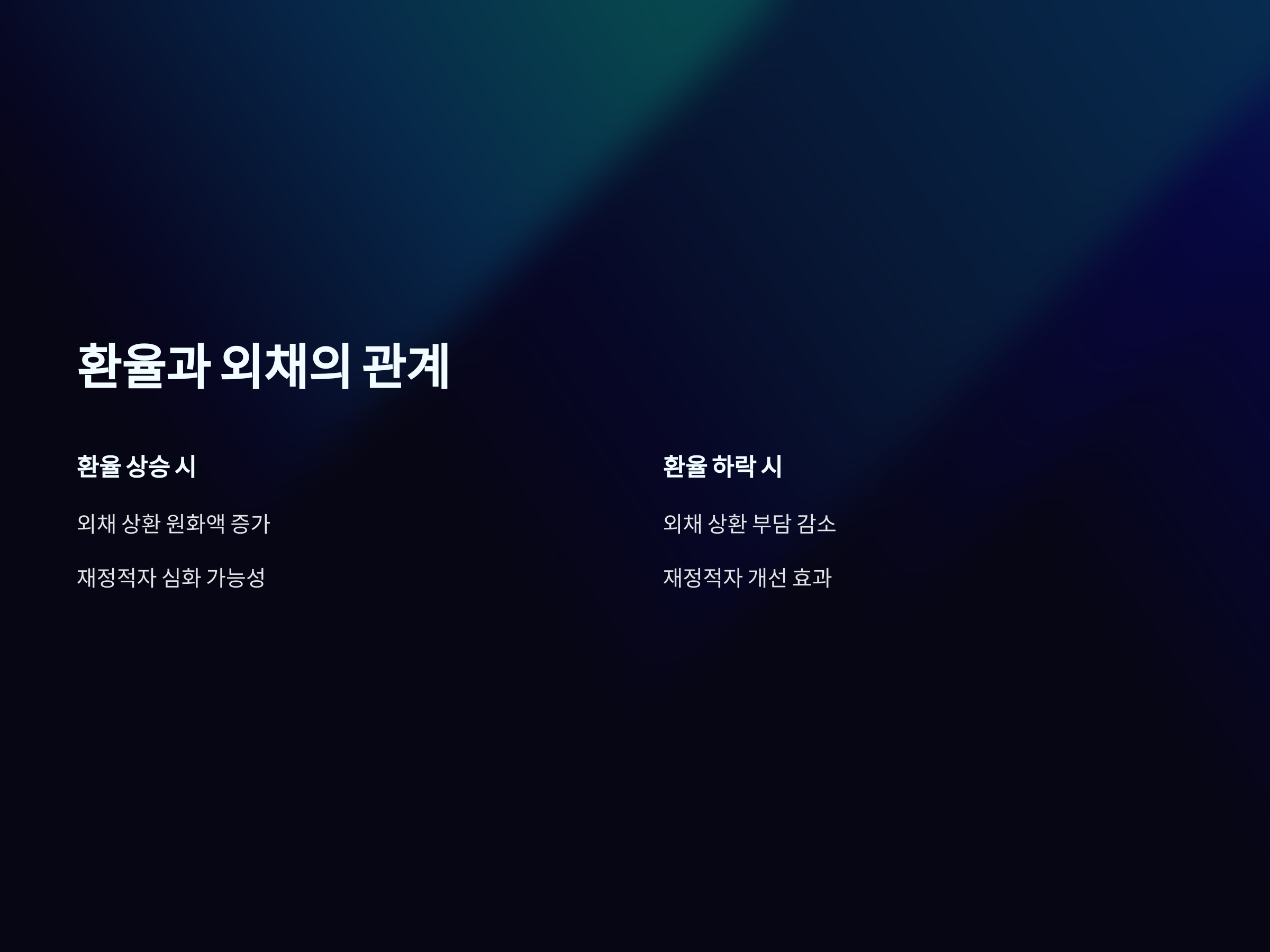 반대로 환율 하락은 외채 상환 부담을 줄여주는 긍정적인 효과를 가져올 수 있습니다. 환율이 낮아지면 외채 상환 시 필요한 외화의 양이 줄어들기 때문에, 외채로 인한 부담이 경감되고 재정적자 개선에 도움을 줄 수 있습니다. 그러나 환율 하락이 과도하게 지속되면, 외환 보유고의 감소를 초래할 수 있고, 이로 인해 외환 유동성 위기가 발생할 위험도 존재합니다.