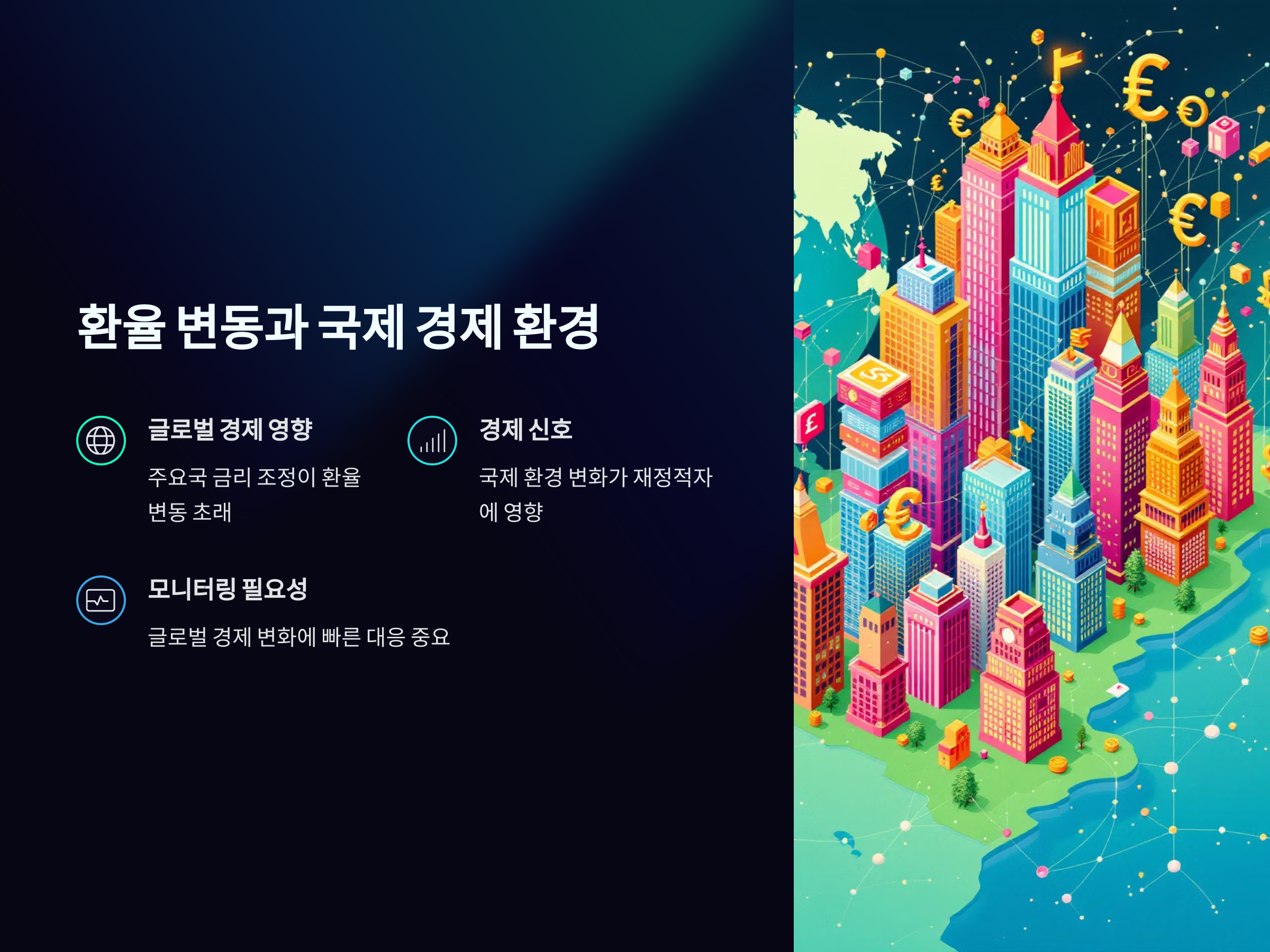 환율 변동은 글로벌 경제 환경에 따라 영향을 받기도 합니다. 국제적으로 주요 경제국들이 금리를 조정하거나, 경제성장률 예측이 달라지면 환율에 변동이 생길 수 있습니다. 이러한 변동은 국가 경제와 재정적자에 영향을 미치는데, 예를 들어, 미국의 금리 인상이 한국 원화 가치에 미치는 영향은 그 대표적인 사례입니다. 국제 경제 환경에서의 변화는 국가 경제에 중요한 신호를 제공하며, 이는 환율 변동을 통해 재정적자에 영향을 줄 수 있습니다.