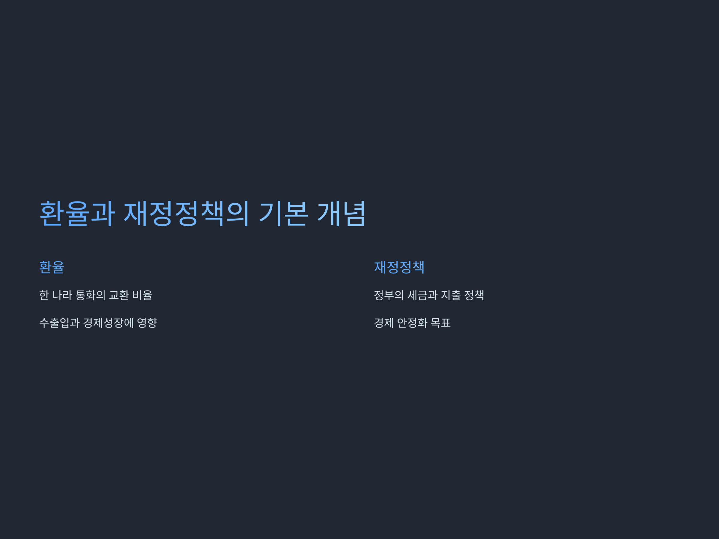 이와 같이 환율 변동은 물가, 수출입, 금리 등 다양한 경제 변수에 영향을 미치기 때문에, 정부는 환율 변동에 따른 경제적 영향을 예측하고 이에 맞는 재정정책을 마련해야 합니다. 특히 환율의 급변동이 국가 경제에 미치는 영향을 완화하기 위해, 정부는 환율 정책과 재정정책을 동시에 고려하는 접근을 해야 합니다.