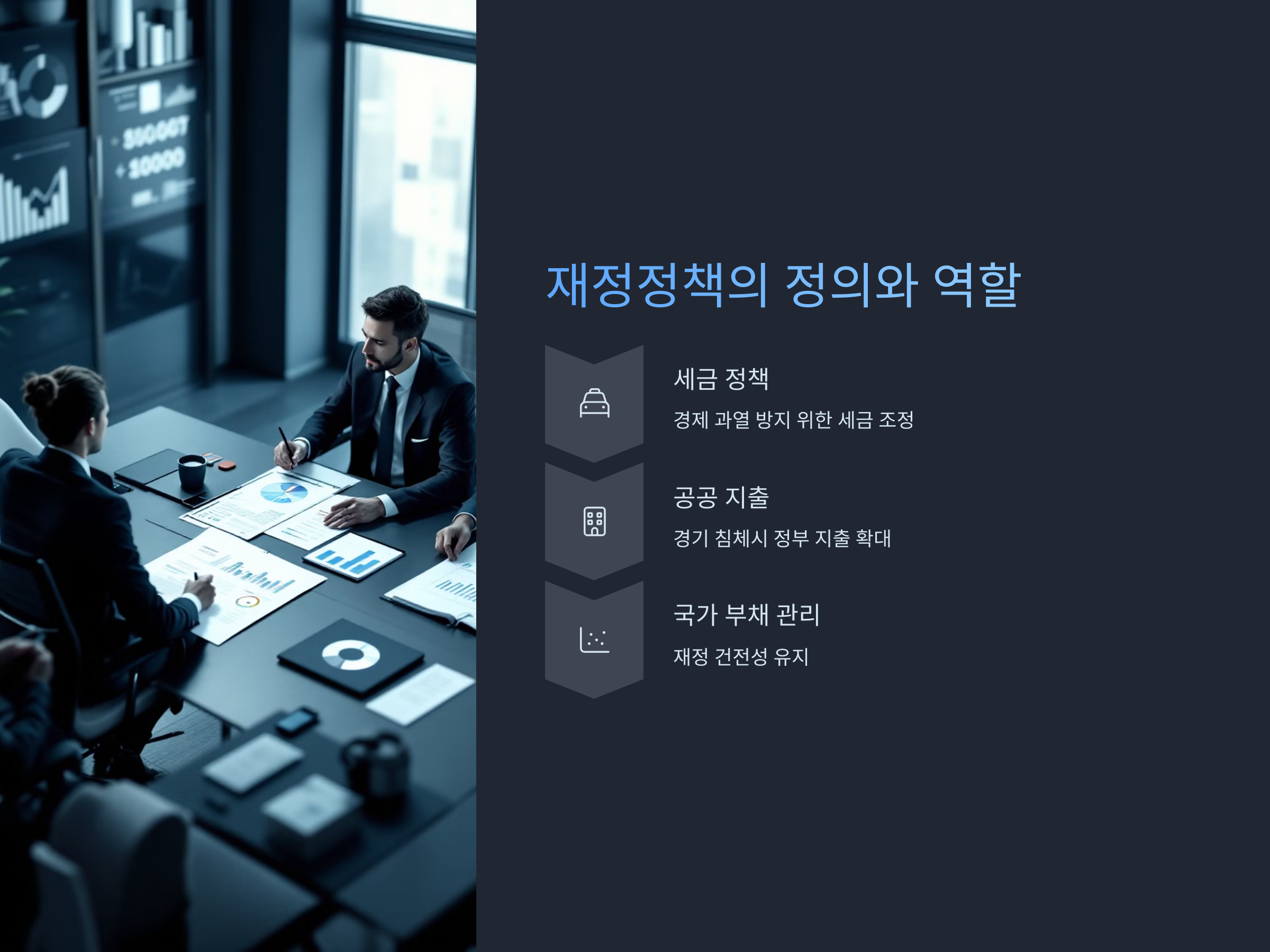 재정정책은 정부가 경제를 안정시키기 위해 사용하는 정책입니다. 주로 세금 정책, 공공 지출, 국가 부채 관리 등이 포함됩니다. 재정정책의 목표는 경제 성장을 촉진하거나 경기 침체를 방지하는 것입니다. 이를 위해 정부는 경제의 과열을 방지하기 위해 세금을 증가시키거나, 경기가 침체될 경우에는 정부 지출을 늘리는 등의 정책을 사용할 수 있습니다.