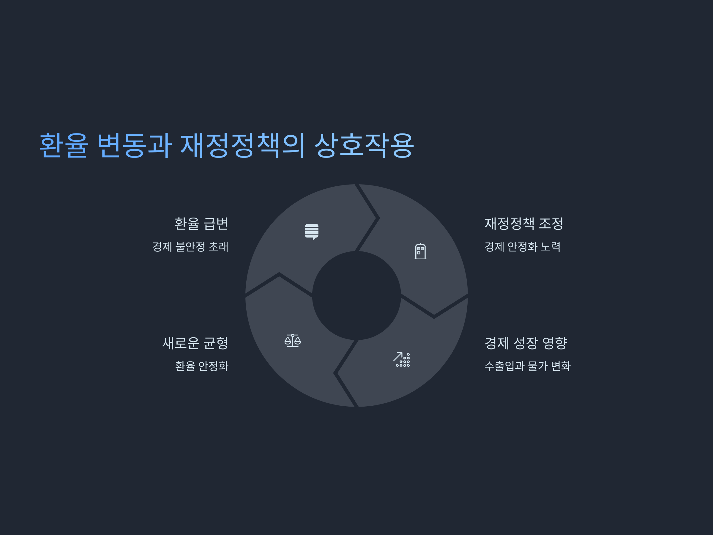 환율 변동과 재정정책은 밀접하게 연결되어 있습니다. 환율이 급변할 경우, 정부는 이를 완화하기 위해 재정정책을 통해 경제를 안정시키려 할 수 있습니다. 예를 들어, 환율이 급락할 경우, 정부는 중앙은행을 통해 외환 시장에 개입하거나, 재정정책을 통해 경제 성장을 촉진하는 방법을 사용할 수 있습니다. 이는 환율을 안정시키고, 국가 경제의 불안을 줄이는 데 도움을 줄 수 있습니다.
