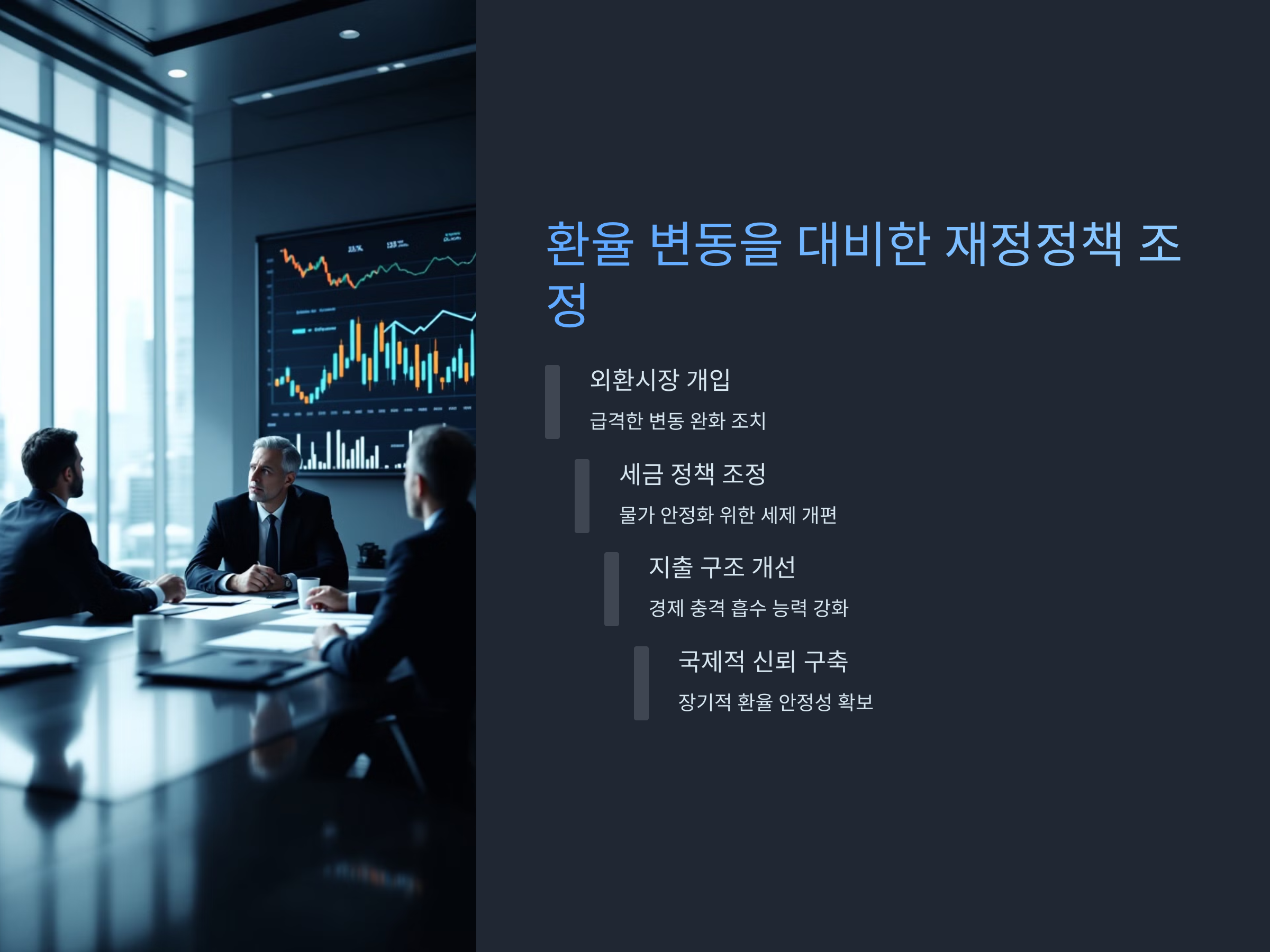 정부는 환율 변동에 대비하기 위해 재정정책을 적절히 조정할 필요가 있습니다. 환율이 급변할 경우, 정부는 외환 시장에서의 개입뿐만 아니라, 국내 경제의 안정성을 확보하기 위해 다양한 방법을 모색해야 합니다. 예를 들어, 환율 변동에 의해 발생할 수 있는 물가 상승을 막기 위해 세금 정책을 조정하거나, 정부 지출을 조절하는 방법을 사용할 수 있습니다.