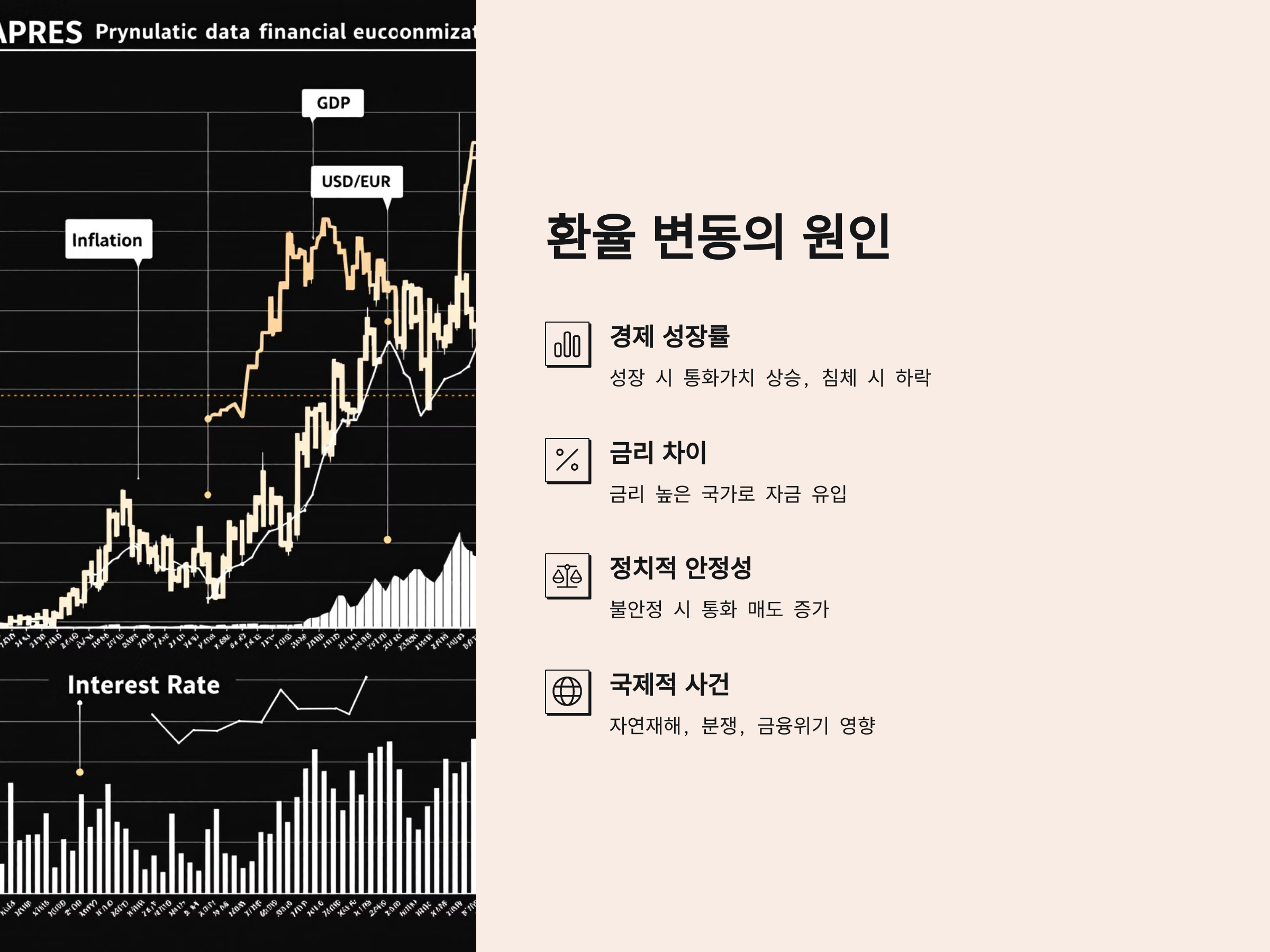 - 정치적 안정성: 정치적 불안정이나 불확실성이 클 경우, 투자자들은 그 국가의 통화를 매도하고 안정적인 국가의 통화를 선호하게 됩니다.