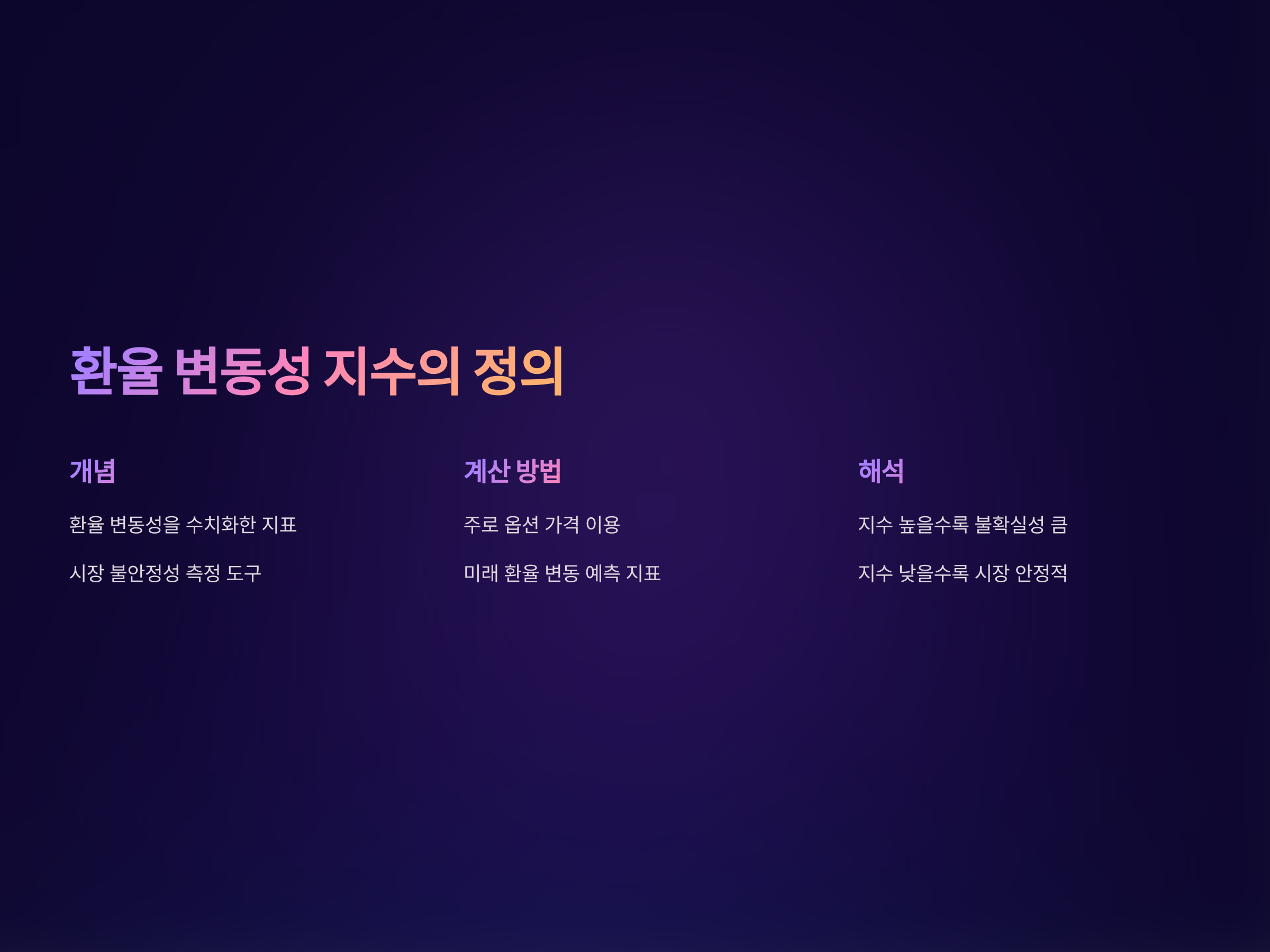환율 변동성 지수는 환율의 변동성을 수치화한 지표로, 이를 통해 환율 시장의 불안정성을 측정할 수 있습니다. 이 지수는 시장 참여자들이 환율 변동에 대한 불확실성을 어떻게 인식하고 있는지를 나타냅니다. 변동성 지수가 높을수록 시장의 불확실성이 크다는 의미입니다.