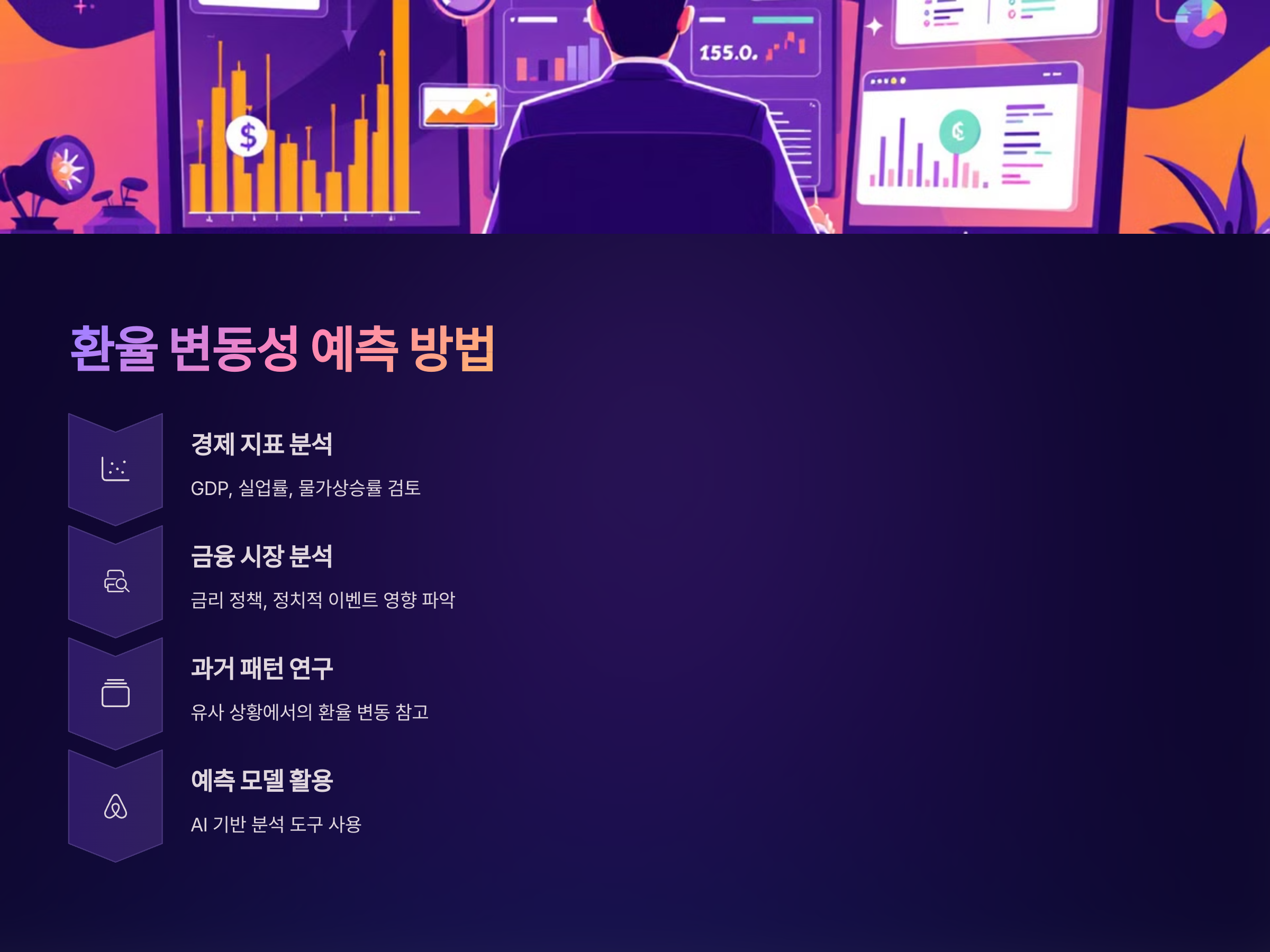 환율 변동성의 예측은 매우 어려운 일이지만, 여러 방법을 통해 향후 변동성을 어느 정도 예측할 수 있습니다. 첫째, 경제 지표를 분석하는 방법이 있습니다. GDP 성장률, 실업률, 물가 상승률 등 주요 경제 지표들이 환율 변동성에 큰 영향을 미치기 때문에, 이러한 지표들을 주의 깊게 살펴보는 것이 중요합니다.