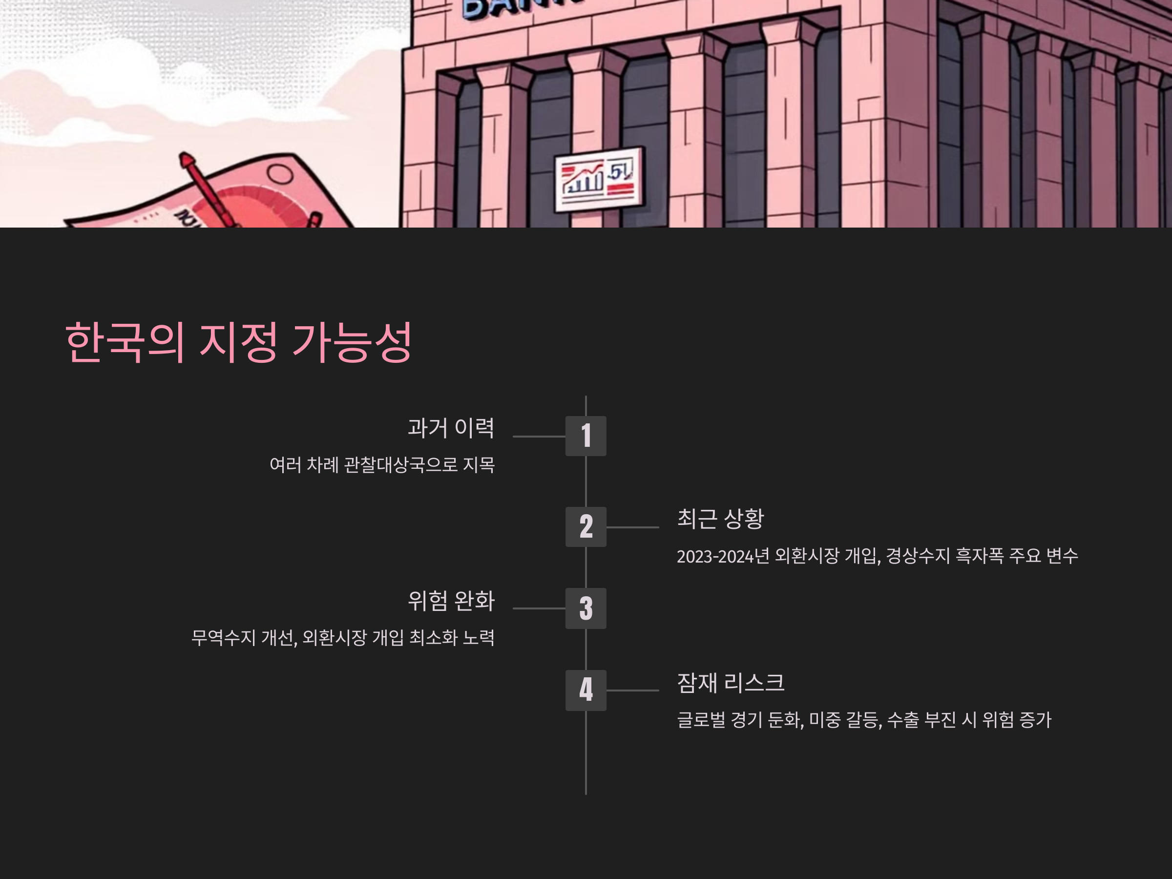 한국은 과거 여러 차례 미국 재무부 환율보고서에서 관찰대상국으로 지목된 바 있습니다. 특히 2023년과 2024년에도 외환시장 개입 내역과 경상수지 흑자폭 등이 주요 변수로 작용하면서 지정 가능성이 꾸준히 언급되었습니다. 다행히도 최근에는 무역수지 개선과 외환시장 개입 최소화 등 자율적인 조정 노력을 기울여 위험이 다소 완화되었다는 평가도 있습니다. 그러나 글로벌 경기 둔화와 미중 갈등 심화, 수출 부진 등이 이어진다면 한국 역시 다시 환율 조작국 지정 리스크에 노출될 수 있습니다. 이에 따라 한국은행과 기획재정부 등 정부기관은 환율 안정화 대책을 강화하고 있으며, 외환시장 투명성 제고와 외환보유액 관리에도 만전을 기하고 있습니다.