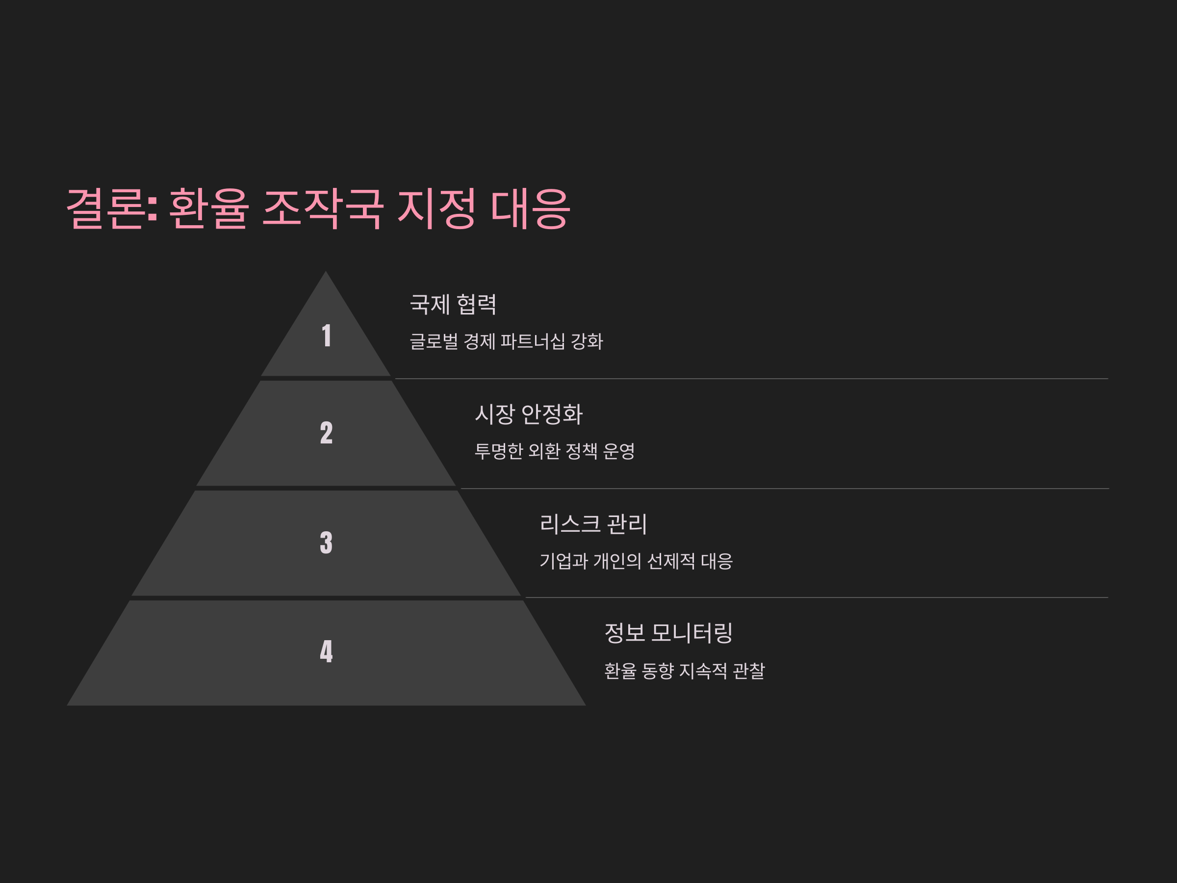 환율 조작국 지정을 방지하기 위해 가장 중요한 것은 환율 시장의 투명성을 강화하고, 인위적 개입을 줄이는 것입니다. 이를 위해 정부는 외환시장 개입 내역을 정기적으로 공개하고, 국제사회에 한국의 외환정책이 시장 원칙에 따른다는 신뢰를 심어줄 필요가 있습니다. 또한 경상수지 흑자를 적절히 관리하고, 무역수지 균형을 맞추는 정책적 노력이 병행돼야 합니다. 특히 미중 무역 갈등 등 외부 변수에 따른 급격한 환율 변동에 대응하기 위해서는 외환보유액 확충, 통화스왑 확대 등 안전장치를 강화하는 것도 중요합니다. 무엇보다 글로벌 기준에 맞는 환율 정책 수립이 필수적입니다.