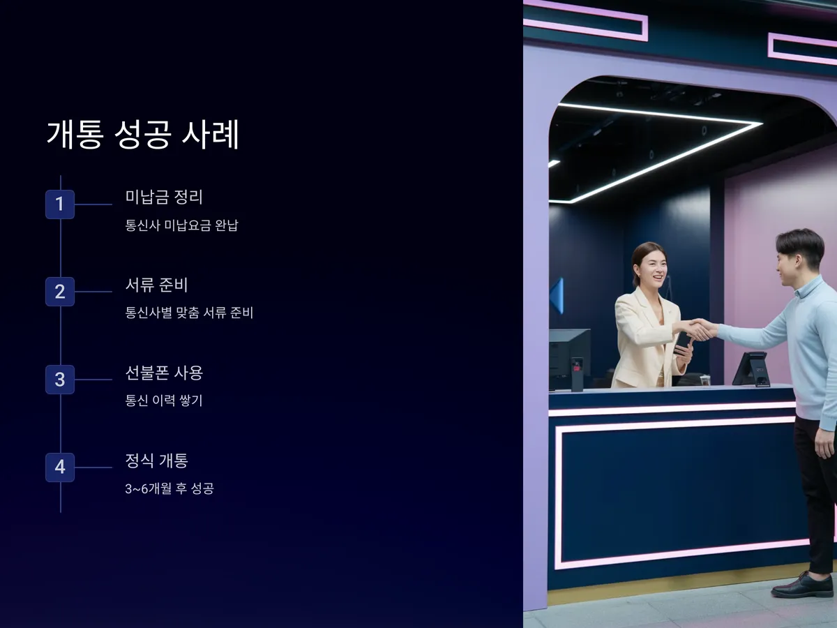 실제로 많은 분들이 인가 이후 3~6개월 사이에 휴대폰 개통에 성공하고 있습니다. 공통적으로 확인되는 성공 요인은 다음과 같습니다. 첫째, 통신사 미납 요금을 정리한 후 관련 증빙서류를 준비했다는 점입니다. 둘째, 개통을 원하는 통신사의 정책에 따라 전략적으로 서류를 준비하고, 필요 시 가족 명의 개통을 병행해 사용했습니다.
