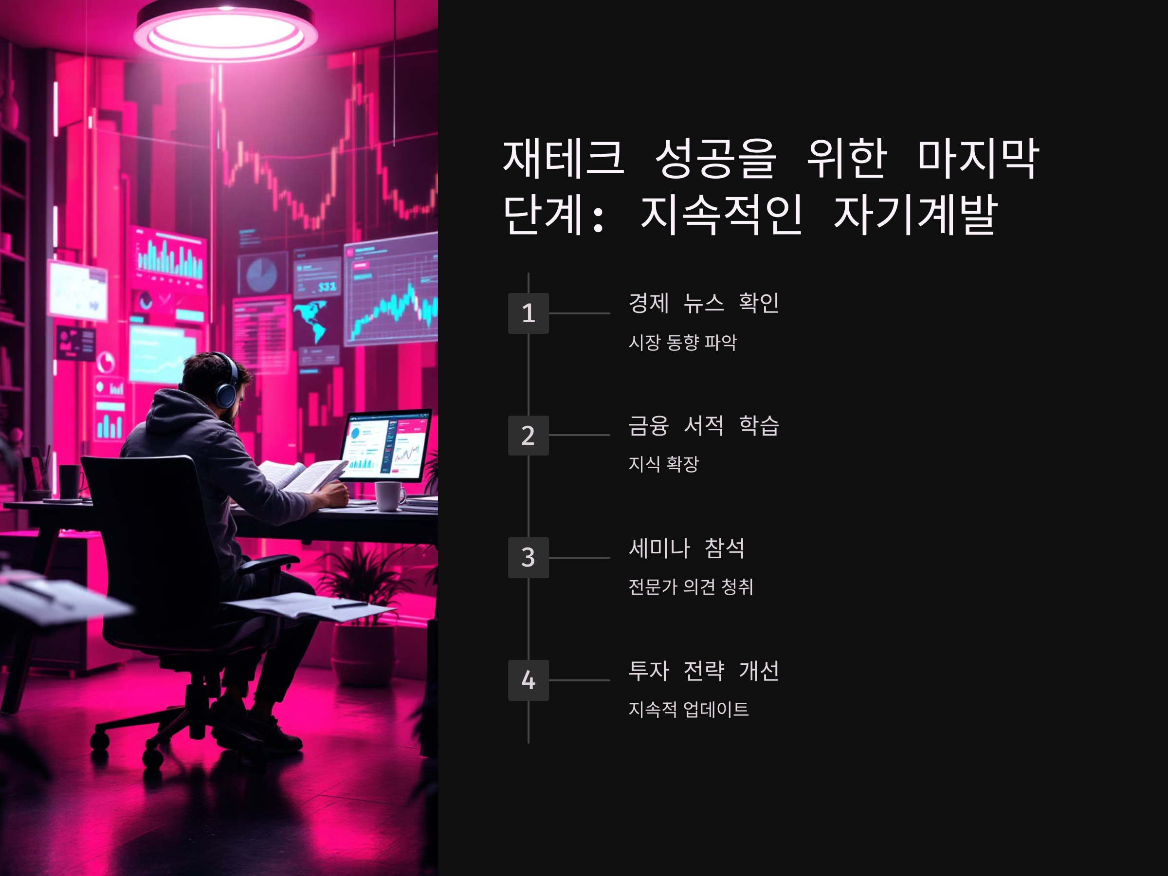 재테크에서 중요한 것은 '지속적인 자기계발'입니다. 재테크는 한 번의 투자로 끝나는 것이 아니며, 시장의 변화에 따라 전략을 계속해서 조정해야 합니다. 따라서 끊임없이 금융에 대한 지식을 쌓고, 새로운 투자 기회를 찾아보는 것이 중요합니다.