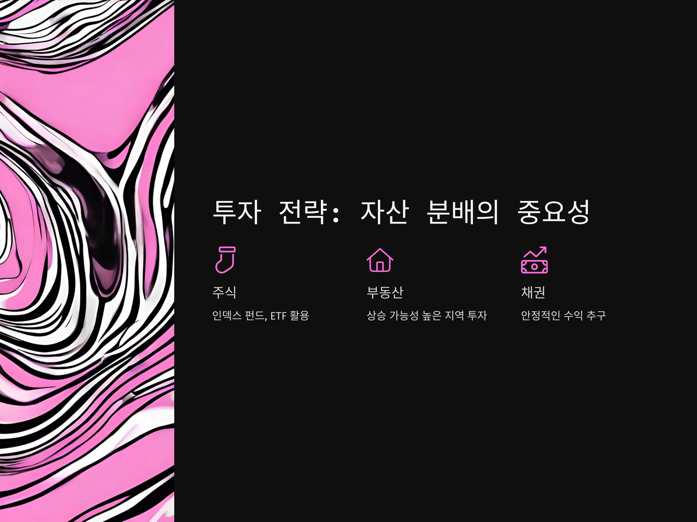 - 첫 번째로 주식이나 인덱스 펀드에 분산 투자하는 방법을 추천합니다. 안정적인 수익을 기대할 수 있는 자산부터 시작하고, 리스크가 큰 자산은 점차 늘려가는 것이 좋습니다.
