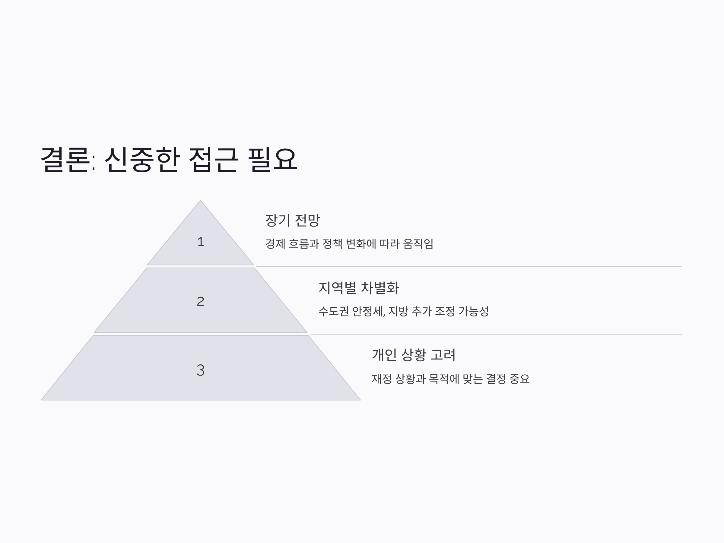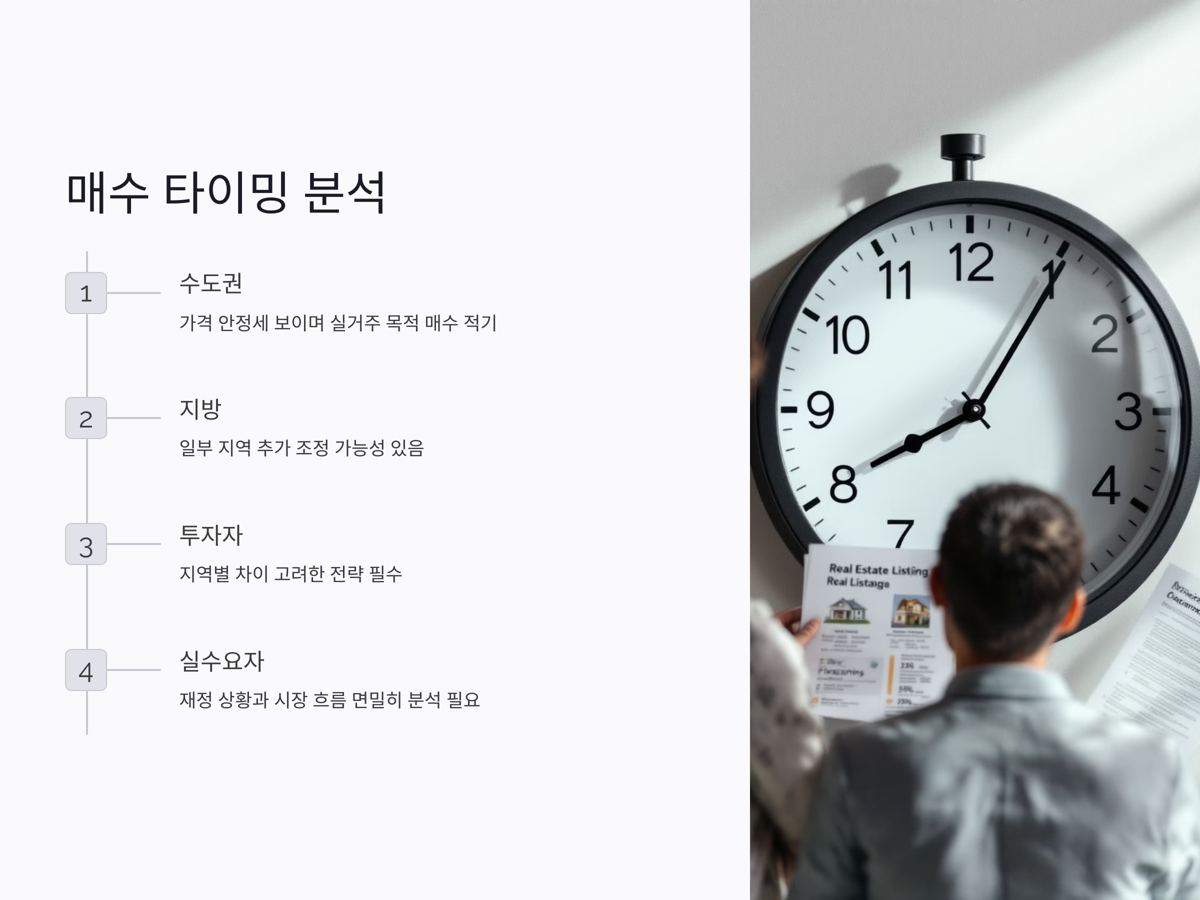 - 실수요 위주의 접근: 투자보다는 실거주 목적의 주택 구매가 유리한 시기