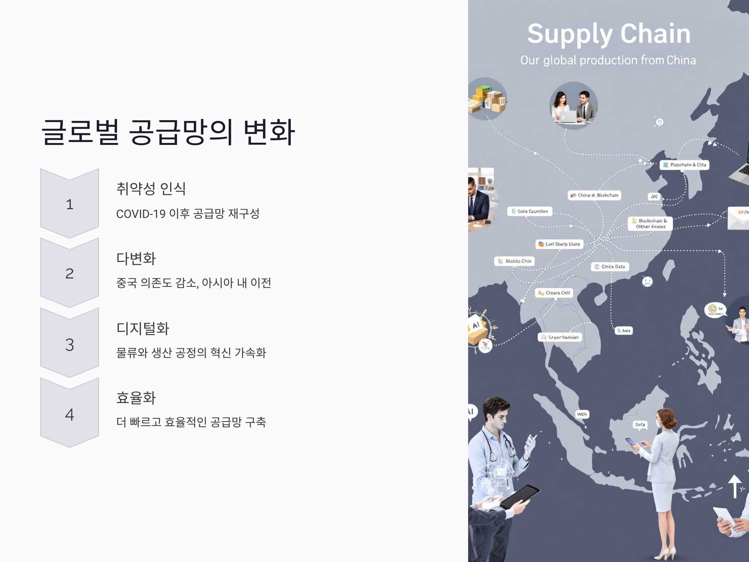 글로벌 공급망은 2025년에도 여전히 주요한 경제적 변수로 작용할 것입니다. COVID-19 팬데믹 이후, 많은 기업들은 공급망의 취약성을 경험했고, 이에 따라 공급망을 재구성하고 리스크를 분산시키려는 움직임이 강해졌습니다. 특히, 아시아 국가들은 여전히 주요한 제조업 중심지로 남아 있지만, 공급망의 다변화가 이루어지고 있습니다.