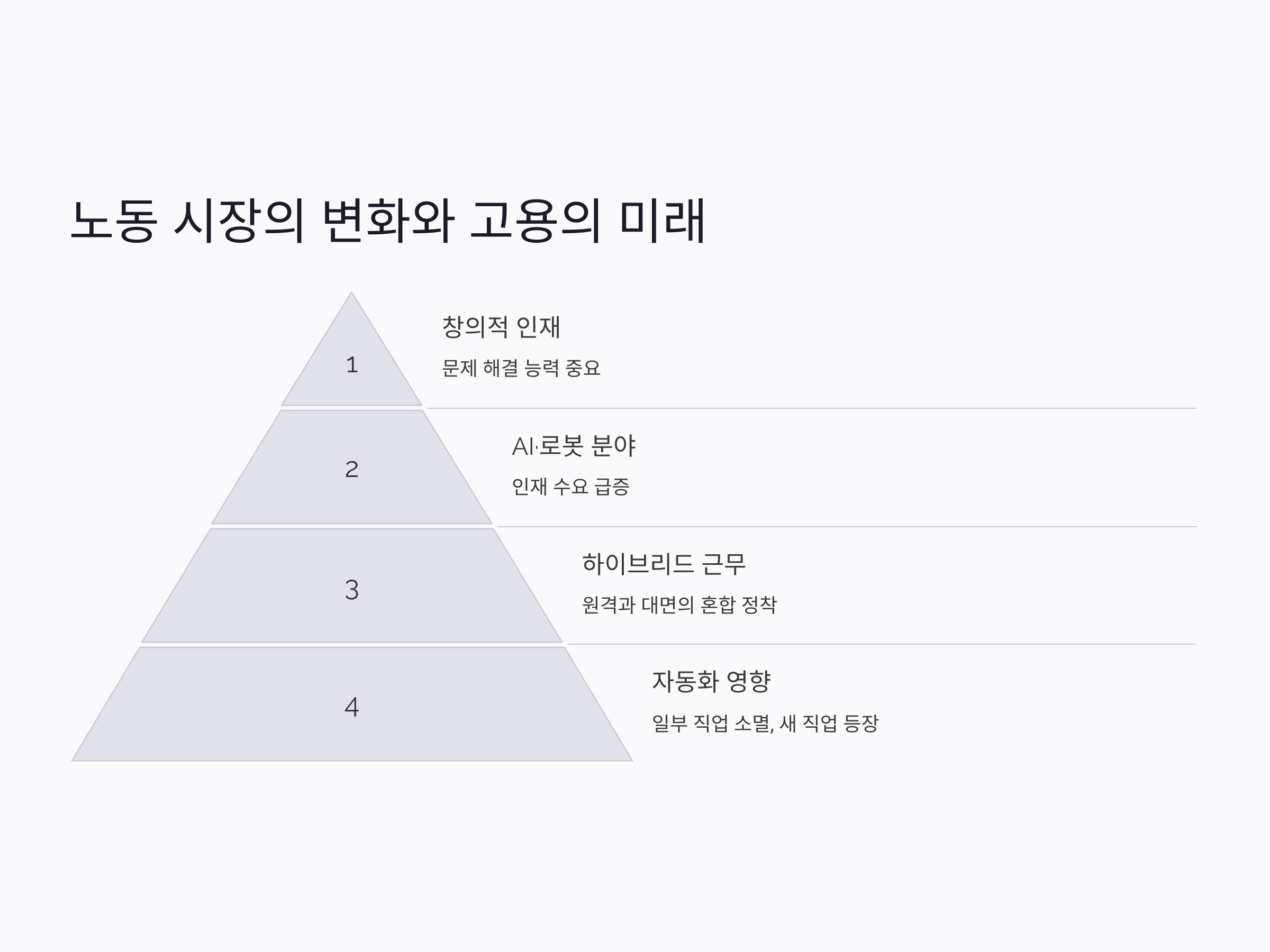2025년에는 노동 시장에서도 중요한 변화가 일어날 것입니다. 자동화와 인공지능 기술의 발전으로 많은 직업이 사라질 수 있지만, 동시에 새로운 산업과 직업이 등장할 것입니다. 특히, AI와 로봇 공학 분야에서의 인재 수요가 급증할 것으로 예상됩니다.