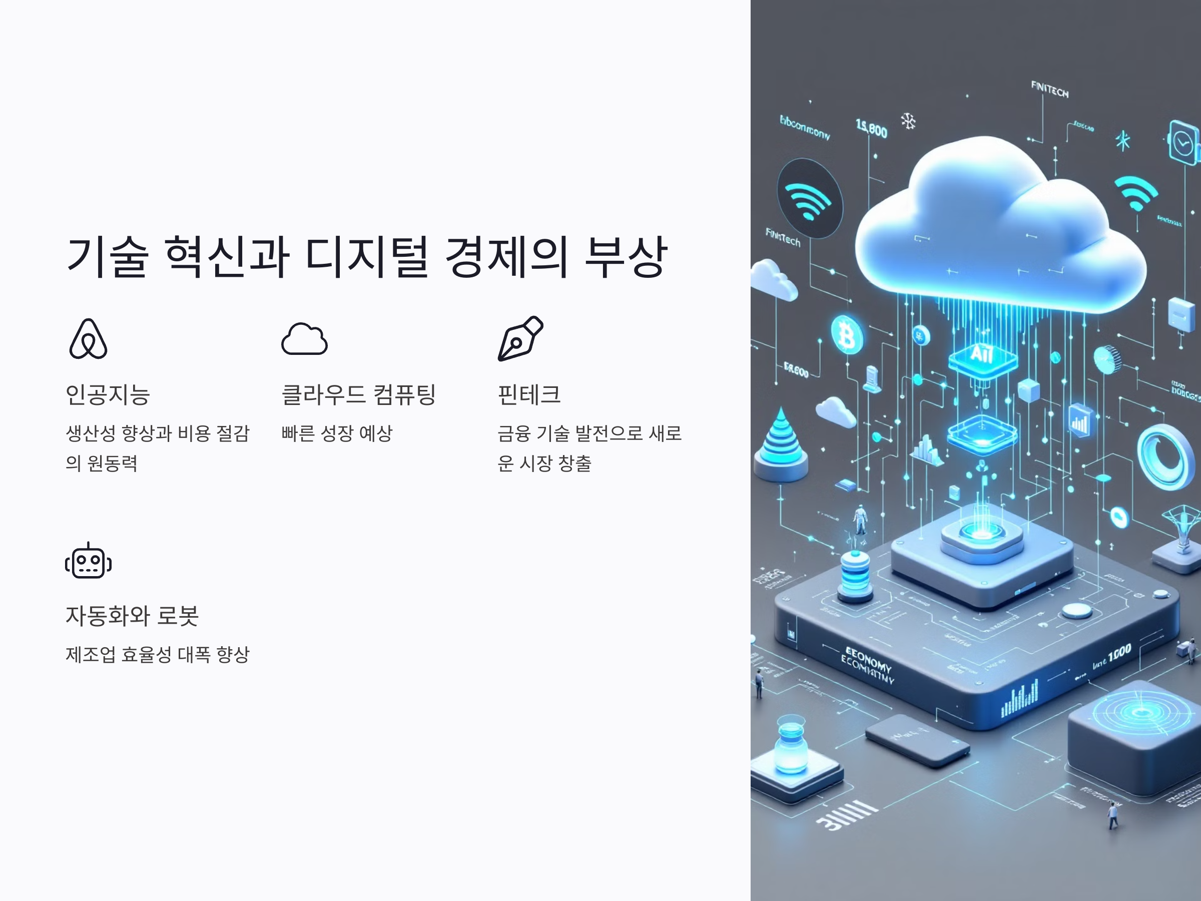 디지털 경제는 2025년의 경제 전망에서 중요한 위치를 차지합니다. AI, 빅데이터, 블록체인, 그리고 5G 기술 등 새로운 기술들이 경제 성장의 원동력이 될 것입니다. 기업들은 생산성 향상과 비용 절감을 위해 이러한 기술을 활용하고 있으며, 디지털 전환이 가속화될 것입니다.