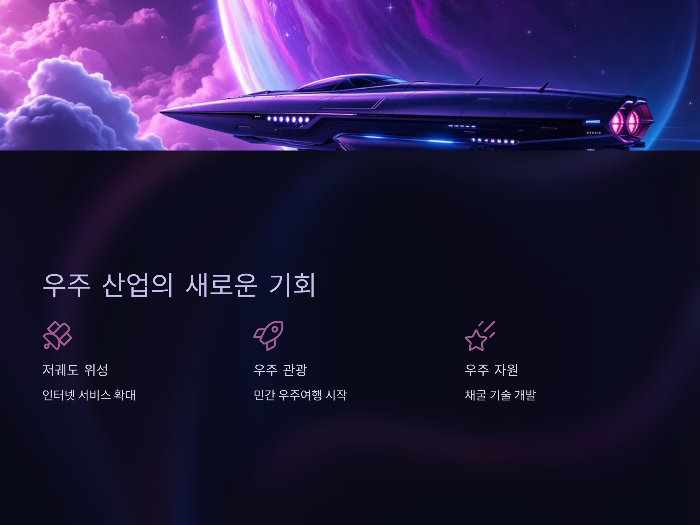 우주 산업은 저궤도 위성 인터넷, 우주 관광, 우주 자원 채굴 등 다양한 분야에서 새로운 기회를 창출하고 있습니다. 정부와 민간 기업의 협력이 강화되면서 우주 산업에 대한 투자가 증가하고 있으며, 이는 관련 기술 개발과 인프라 구축을 가속화하고 있습니다. 투자자들은 우주 산업에 진출한 기업들과 관련 기술을 보유한 업체들을 주목해야 합니다.