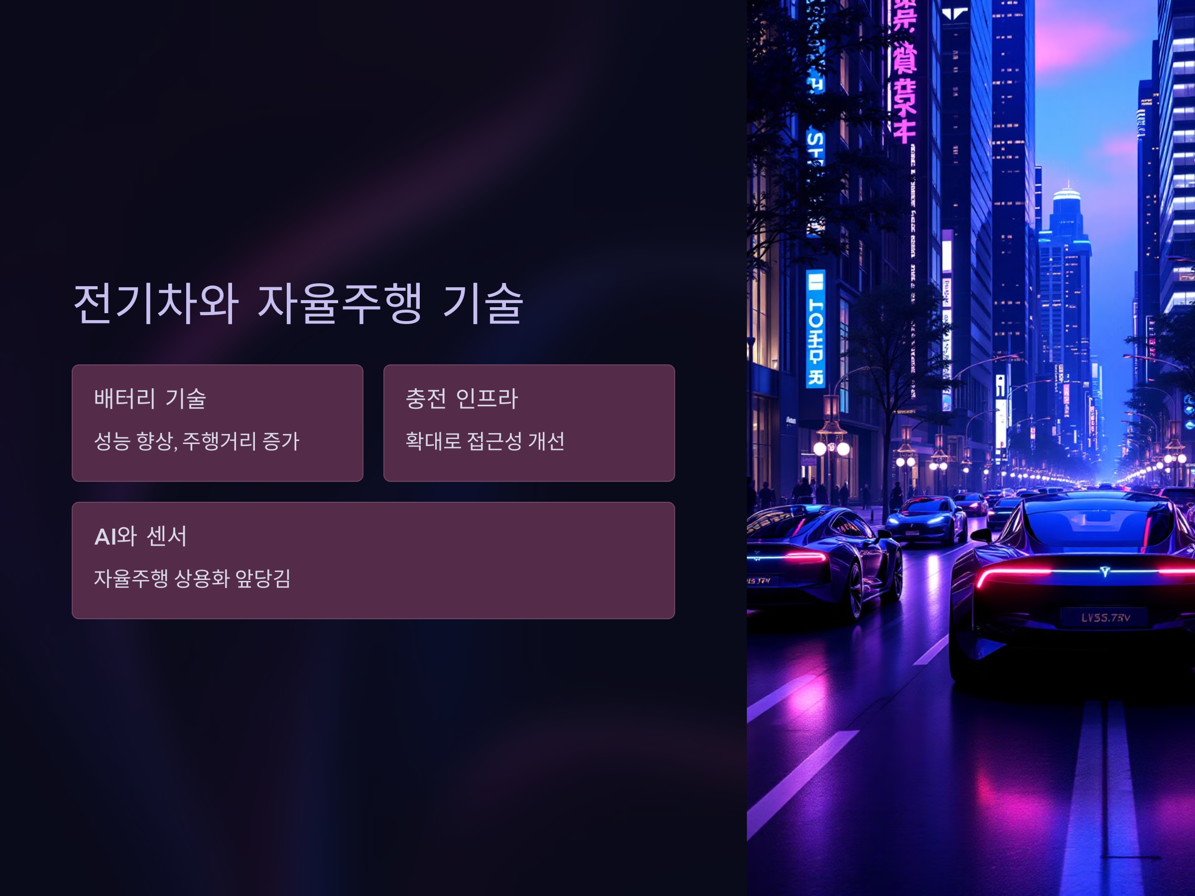전기차와 자율주행 기술은 미래 모빌리티의 핵심으로 부상하고 있습니다. 전기차 시장은 배터리 기술의 발전과 충전 인프라의 확대로 인해 빠르게 성장하고 있으며, 자율주행 기술의 발전은 교통의 혁신을 가져올 것으로 기대됩니다. 특히, AI와 센서 기술의 발전은 자율주행 차량의 상용화를 앞당기고 있으며, 이는 관련 기술 개발 기업과 부품 제조사들에게 새로운 기회를 제공하고 있습니다.
