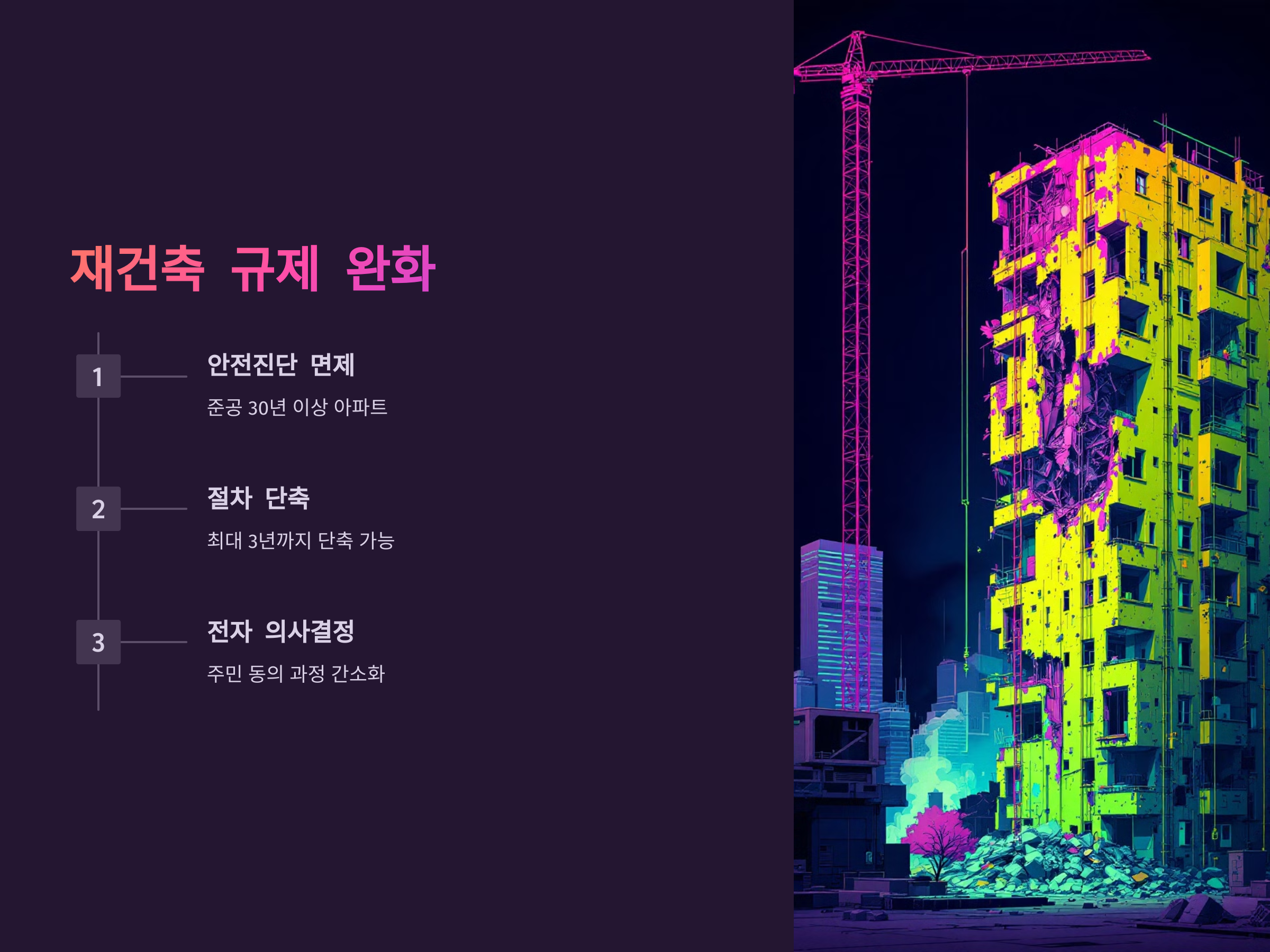 2025년부터 재건축 규제가 완화됩니다. 준공 30년 이상의 아파트는 안전진단 없이 재건축이 가능해지며, 이로 인해 재건축 절차가 최대 3년까지 단축될 수 있습니다【14†source】. 또한, 재건축 절차에 전자적인 주민 의사결정 방식을 도입하여 주민 동의를 더욱 빠르게 받을 수 있게 될 예정입니다.