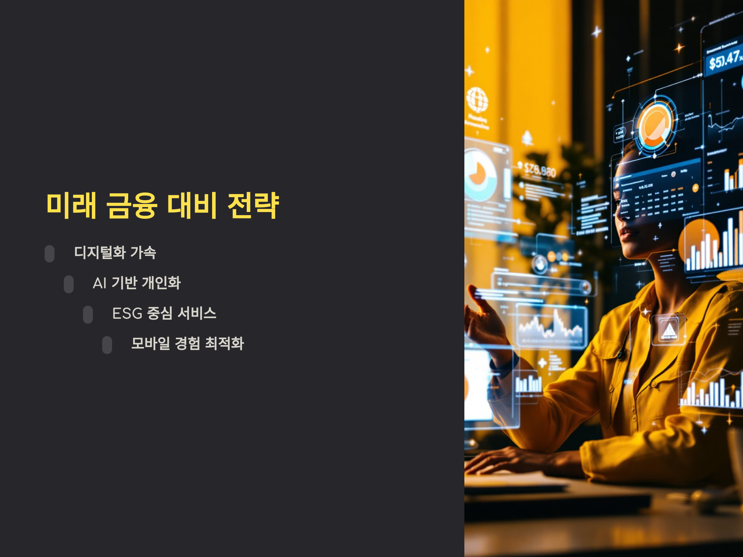 이러한 모바일 퍼스트 전략은 금융 서비스를 보다 직관적이고 손쉬운 접근 방식으로 만들어, 소비자들이 언제 어디서나 금융 서비스를 이용할 수 있게 합니다. 또한, 각종 앱을 통해 소비자들은 실시간으로 계좌 정보, 대출 신청, 투자 현황 등을 확인하고 관리할 수 있게 되며, 이는 금융 거래의 편리함과 효율성을 크게 향상시킬 것입니다.