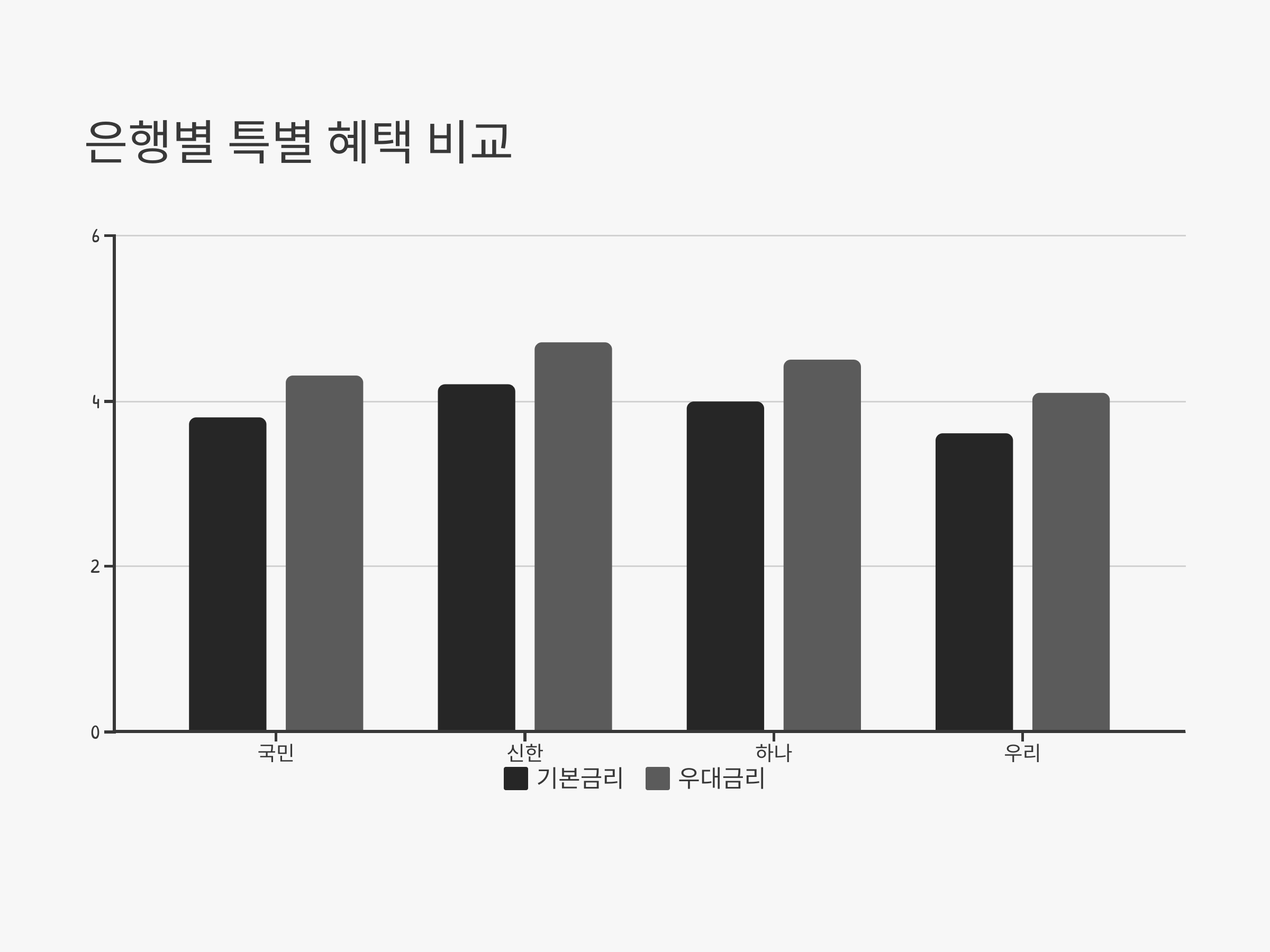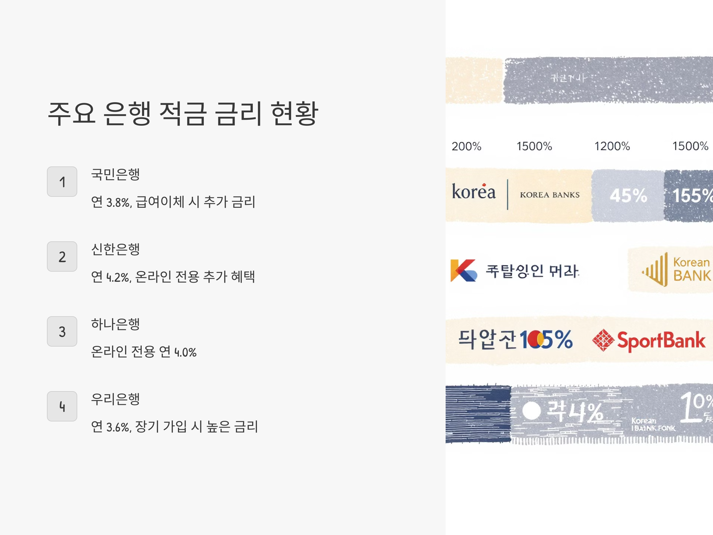 - 국민은행: 국민은행은 기본적으로 연 3.8%의 금리를 제공하고 있으며, 특정 조건(예: 급여 이체, 자동이체 등)을 충족하면 금리가 추가로 상승할 수 있습니다.