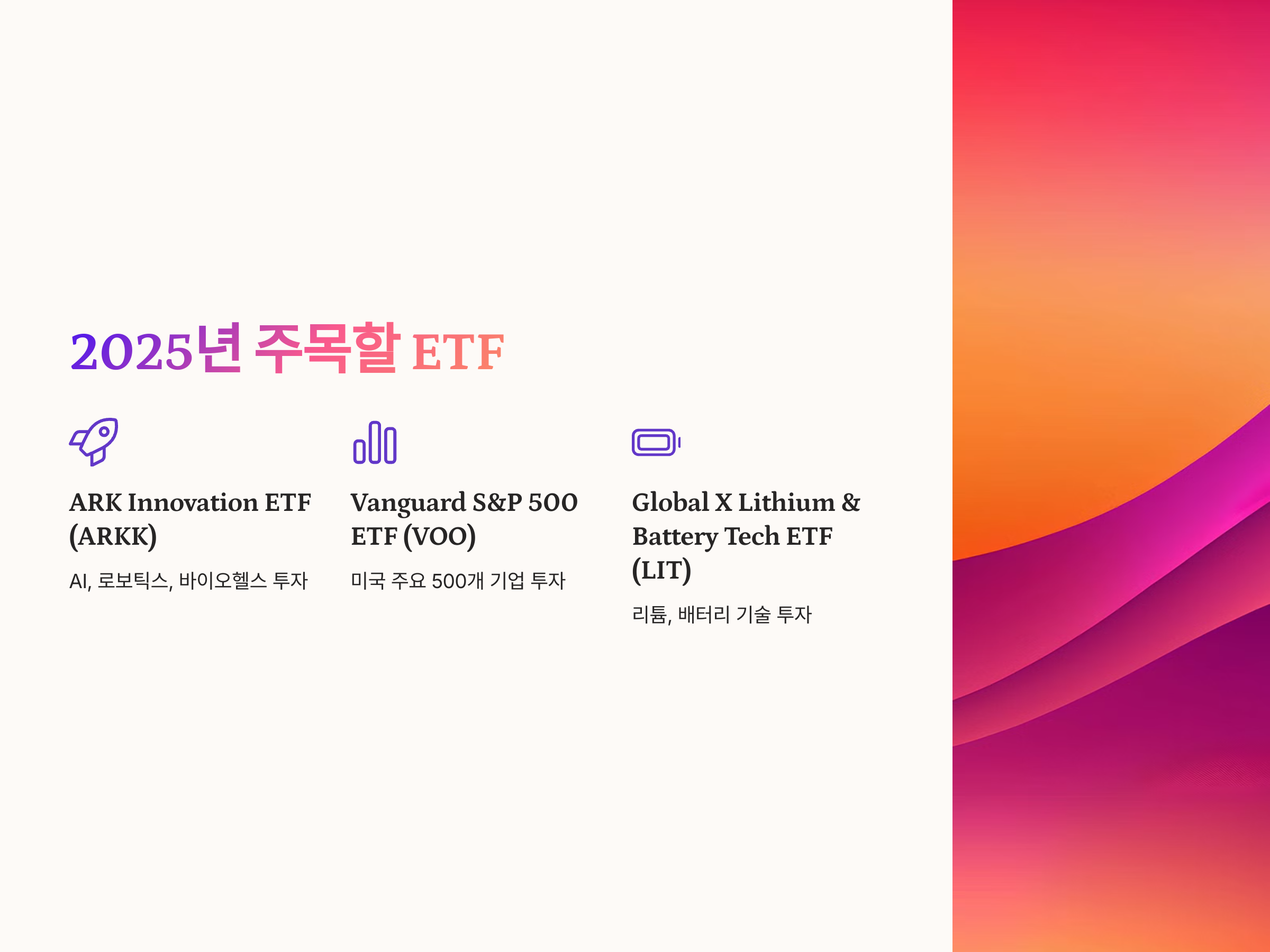 2025년에는 다양한 분야에서 혁신적인 변화가 예상되므로, 다음과 같은 ETF들이 주목받을 가능성이 높습니다.