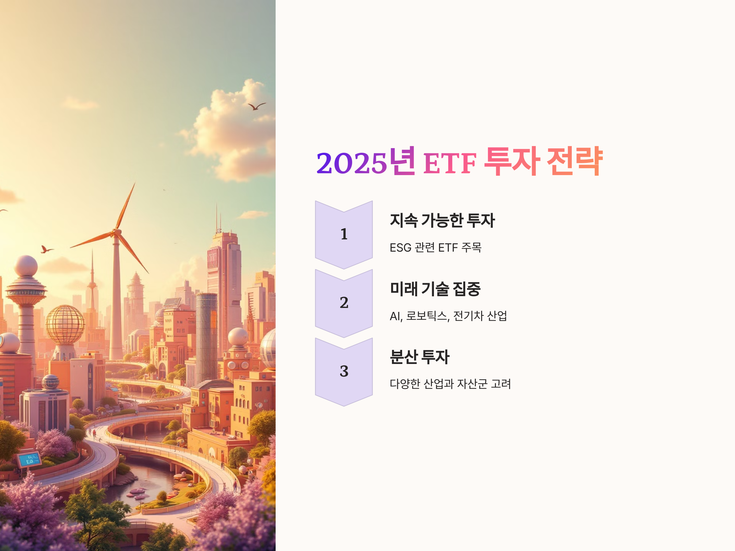 2025년에는 다양한 경제적, 기술적 변화가 예상되므로, 지속 가능한 투자와 미래 기술에 집중하는 것이 유리합니다. ESG(환경, 사회, 거버넌스) 투자와 관련된 ETF들이 인기를 끌 것으로 예상되며, 또한 AI, 로보틱스, 전기차와 같은 혁신적인 산업에 투자하는 ETF들도 큰 성장을 이룰 것입니다.
