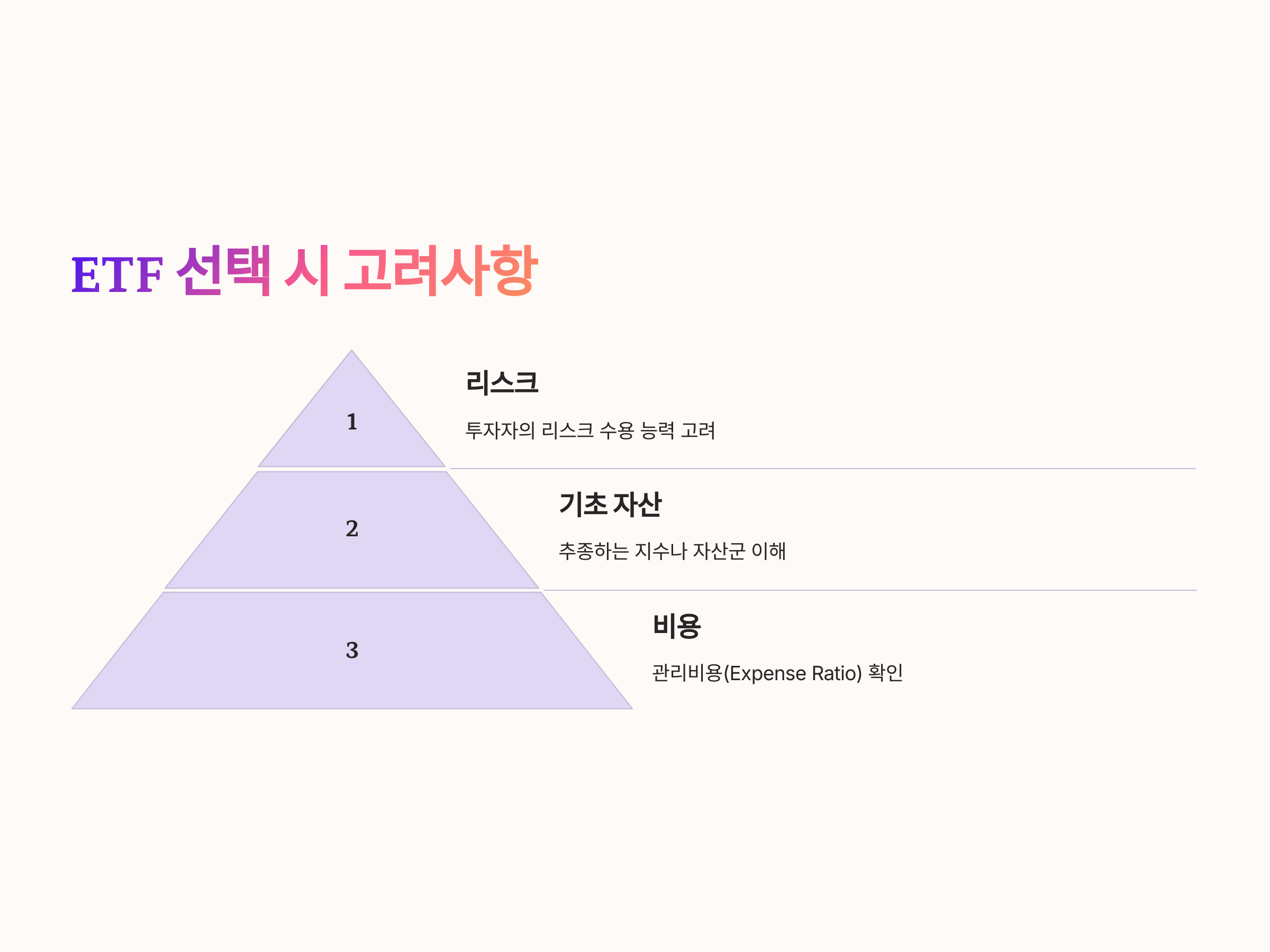 ETF를 선택할 때 고려해야 할 주요 요소는 다음과 같습니다.