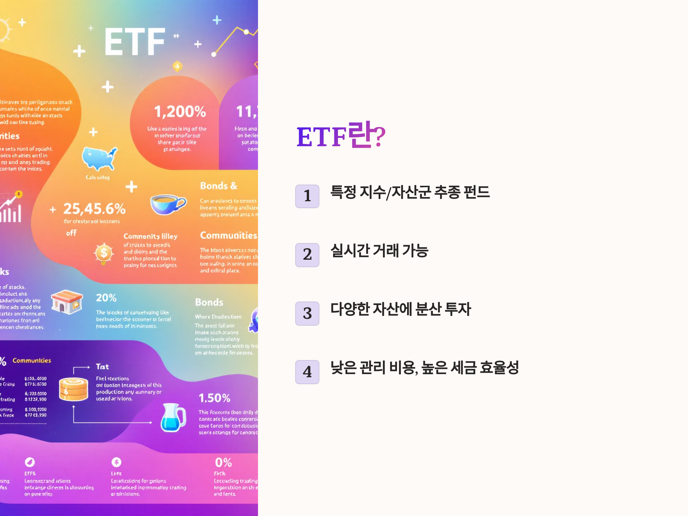 ETF(Exchange Traded Fund)는 특정 지수나 자산군을 추종하는 펀드로, 주식처럼 거래소에서 실시간으로 사고팔 수 있는 금융 상품입니다. 일반적으로 주식과 채권, 원자재 등 다양한 자산에 분산 투자할 수 있으며, 적은 금액으로도 다수의 자산에 투자할 수 있다는 점에서 큰 매력을 지니고 있습니다. 또한, ETF는 보통 낮은 관리 비용을 자랑하고, 세금 효율성 또한 높은 편입니다.