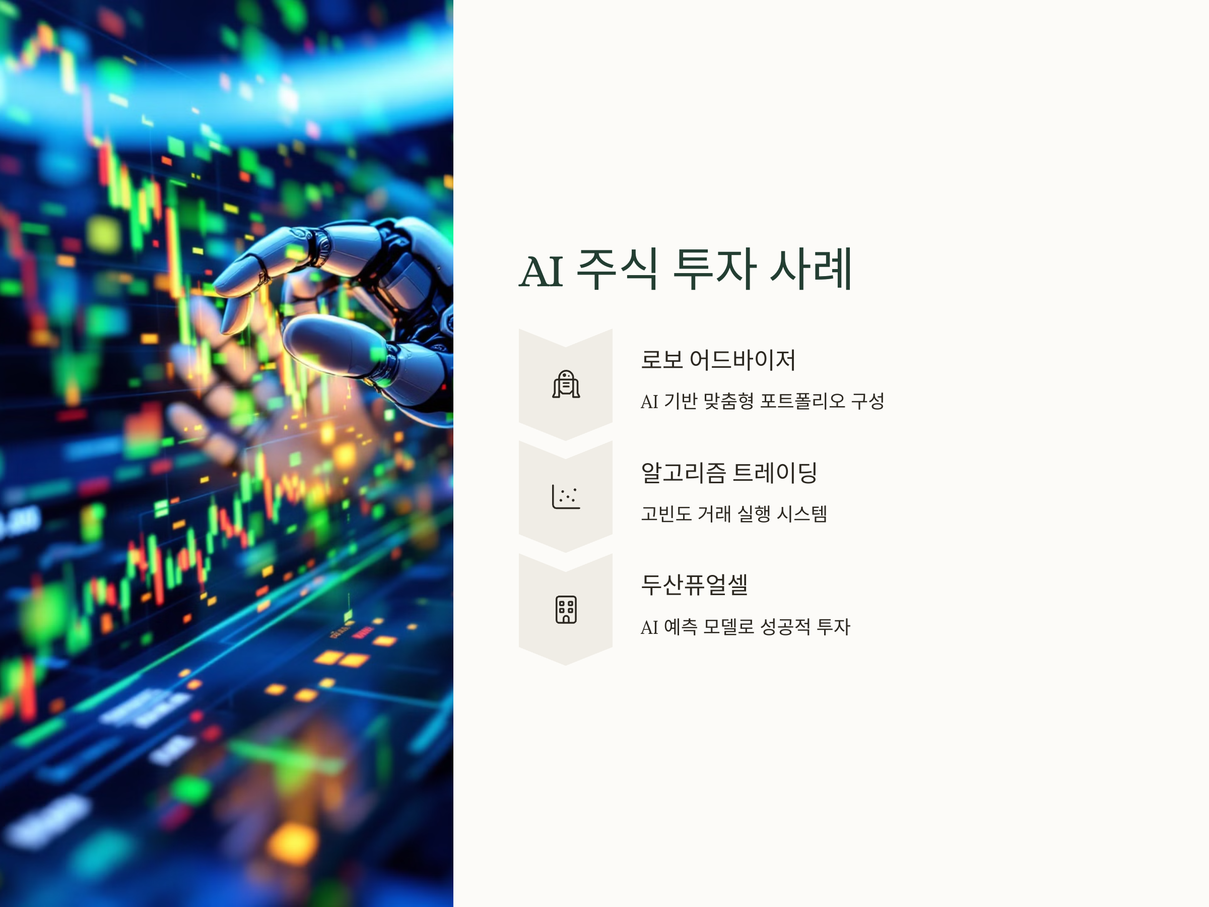 한 예로, 두산퓨얼셀은 AI 기반의 주식 예측 모델을 개발해 주식 투자에 성공적인 결과를 가져온 사례가 있습니다. 이 모델은 주식 시장의 다양한 데이터를 분석하여, 시장의 트렌드 변화를 실시간으로 감지하고 투자 결정을 지원합니다.